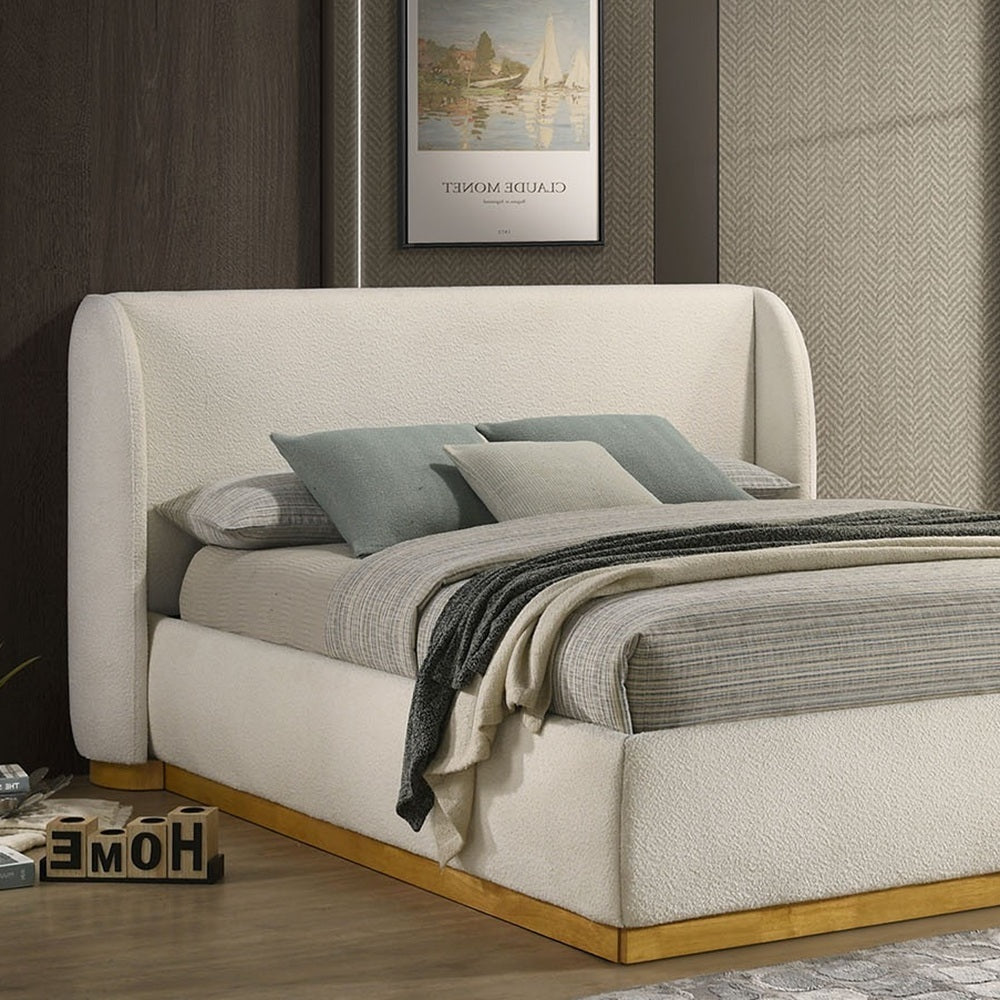 Features:- Contemporary Style White/Natural Oak Boucle Fabric, Solid Rubberwood, Engineered Wood Wingback Headboard Gold-painted Plinth Oak Wood Base 100% Polyester Fabric Mattress Ready.