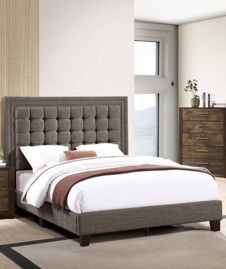 Queen Size 1pc Bed Nailhead Trim Button Tufted Burlap Fabric Charcoal Finish Bedroom Furniture