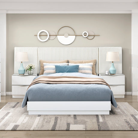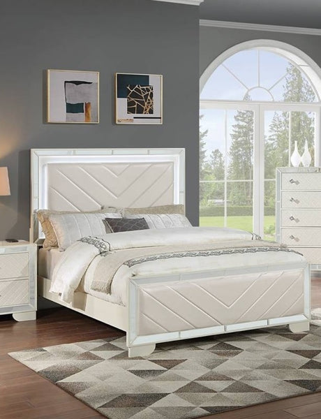 Metallic White Finish Queen Bed LED Headboard Button-Tufted Modern Glam Bedroom Furniture