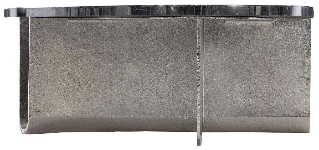 Bernhardt Interiors presents the striking Tegan Cocktail Table, a masterwork of modern artistic design. The top, made of laminated Black Forest marble, features intricate veining that mimics the natural patterns of stone landscapes. The cast aluminum base flows through the marble in a river-like shape and is finished in radiant Shiny Nickel. This bold and evocative piece functions as both cocktail table and sculptural centerpiece for high-end interiors.
