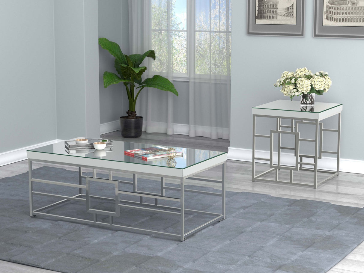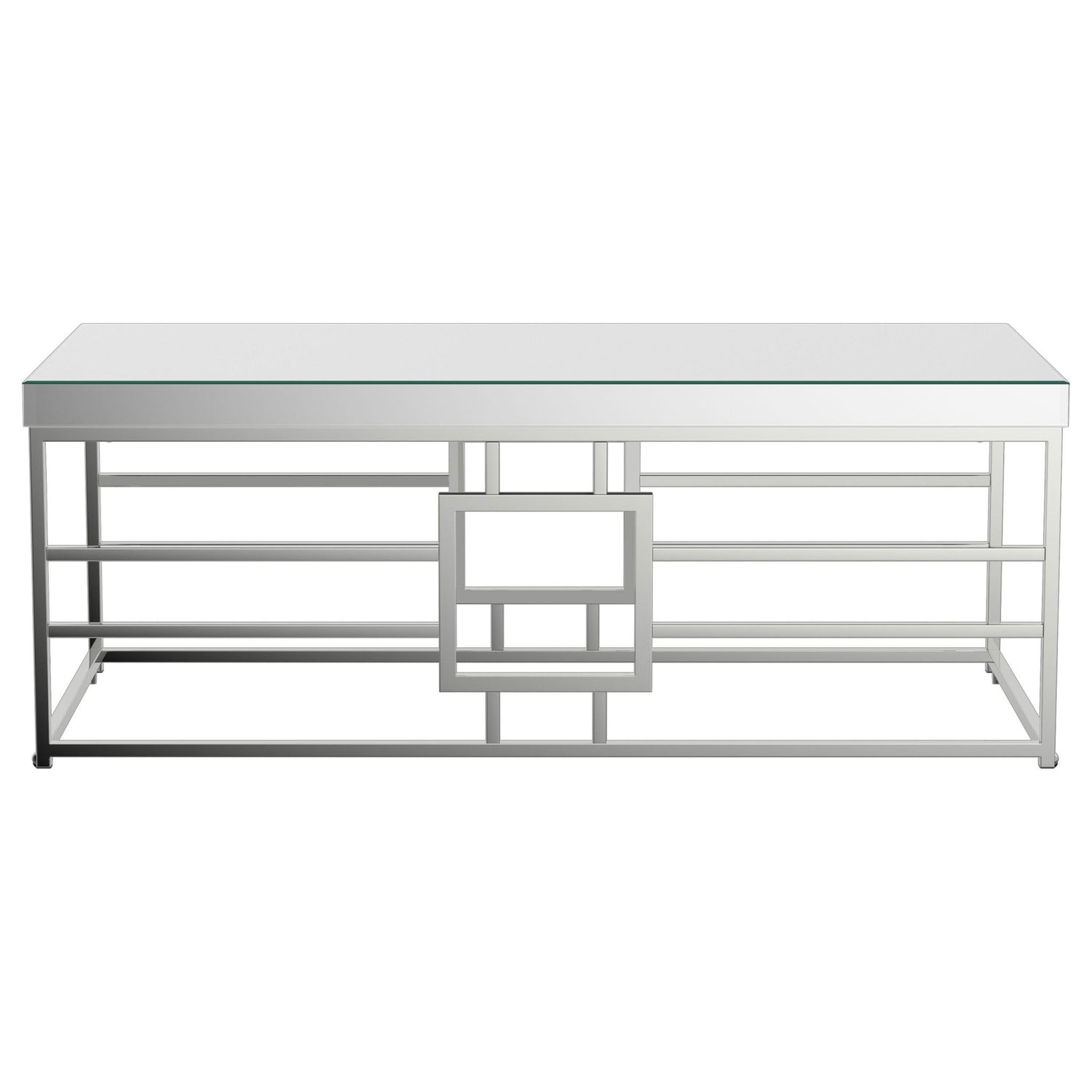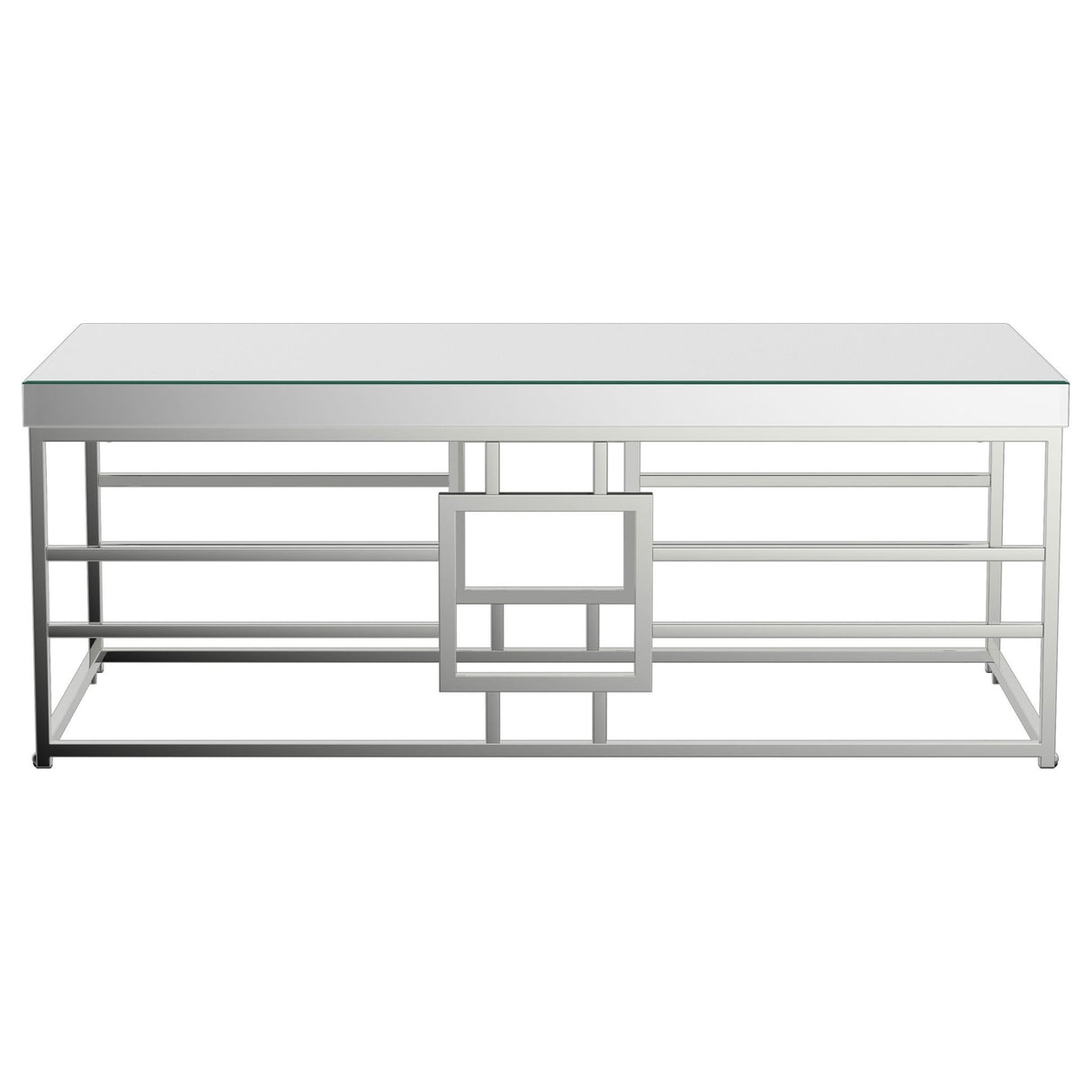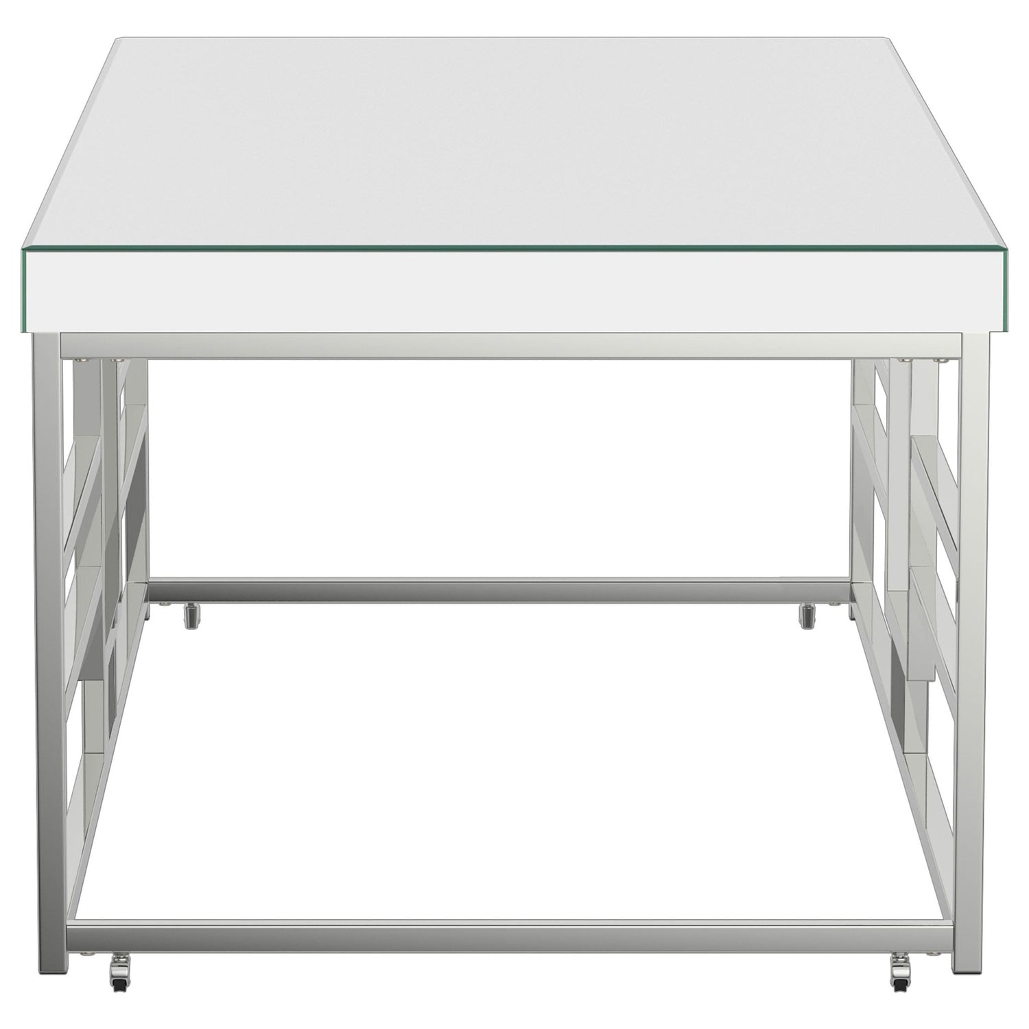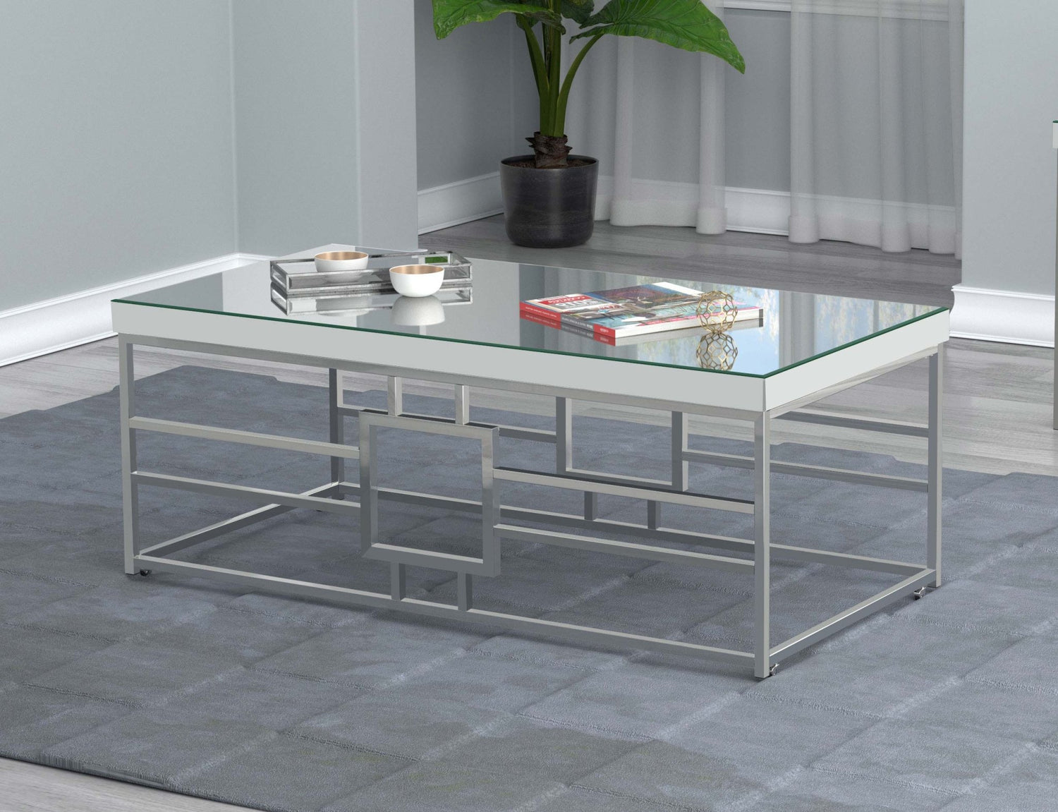 Enjoy coffee in your contemporary space with this coffee table. Pay homage to modern design with this classy mirrored tabletop. Gaze upon the architecturally-inspired geometric design. Metal frame in a chrome finish combines strength and beauty. Casters allow you to move this coffee table at-will to set up your desired look.