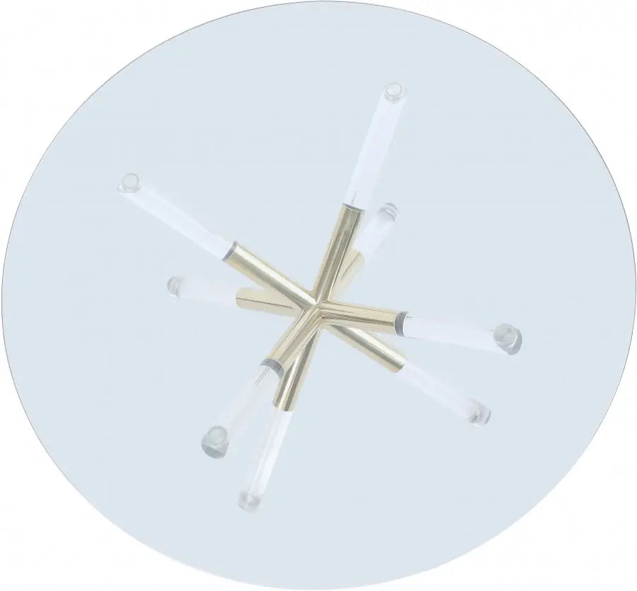 Bring modern pizzazz to your living room with this Mercury Acrylic Gold Coffee Table by Meridian Furniture. The base features a pedestal design with acrylic gold legs for a touch of contemporary fun. The tempered glass top offers plenty of room for holding items like framed pictures or magazines. The top is clear, so you can easily see the beauty of the metallic legs showing through, giving your living room or den a little something extra.