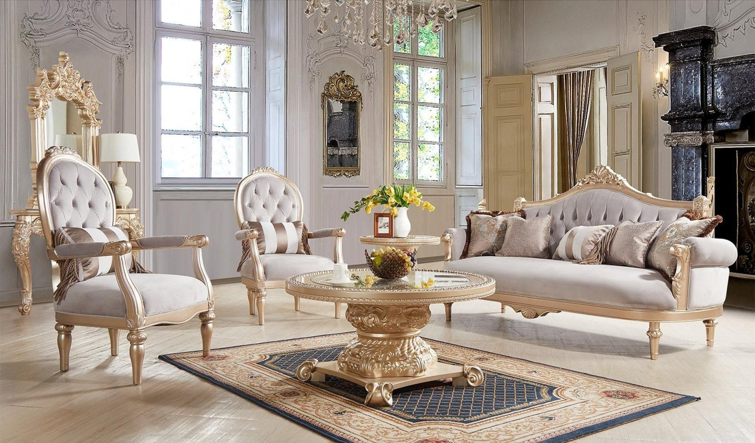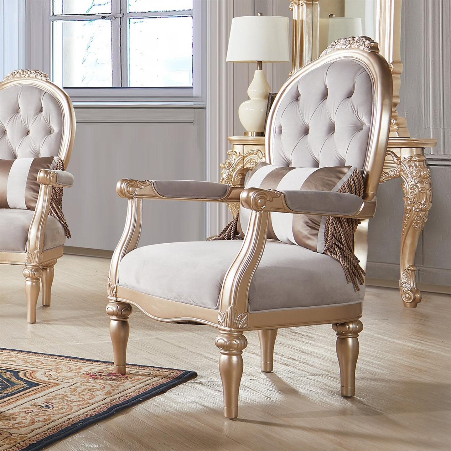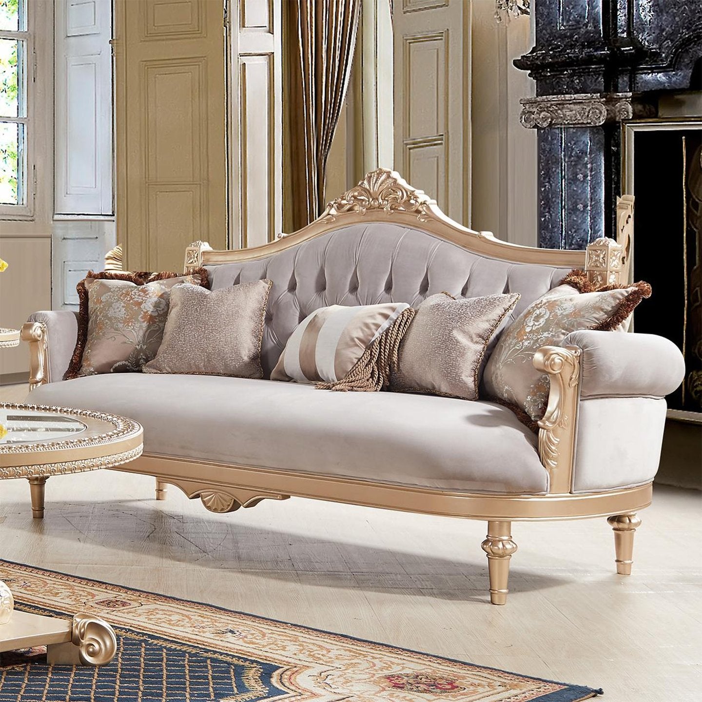 Hd-2670 Traditional Living Room Set In Light Gray Fabric & Gold Finish | Homey Design