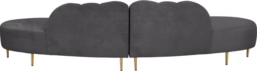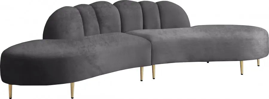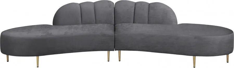 Elevate your interior with the addition of this Divine velvet two-piece sectional. This lovely seating option features Grey velvet upholstery covering every last inch, ensuring your total comfort as you lounge the day away. The shell shape and deep channel tufting along with the piece’s gold stainless steel legs lend it an uber contemporary feel that is well-suited for your modern décor.