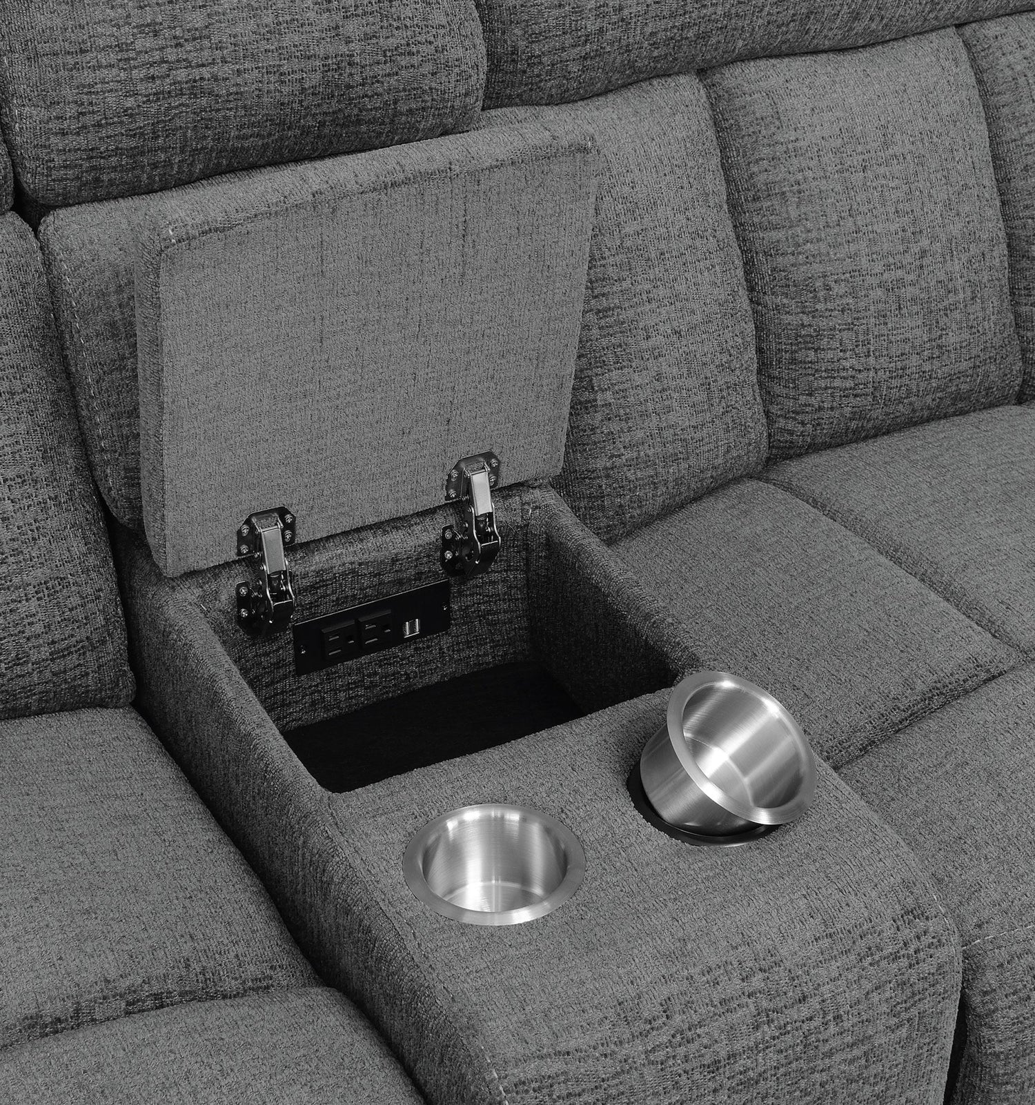 Bahrain Upholstered Motion Loveseat with Console Charcoal | Coaster is available