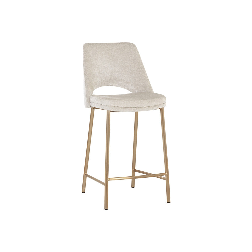 Dashing with contemporary style, this counter stool is designed with a refined touch. Upholstered in bergen french blue and taupe fabrics with a stylish cutout on the seatback. Completed with an antique brass stainless steel base. Also available in a dining chair version.