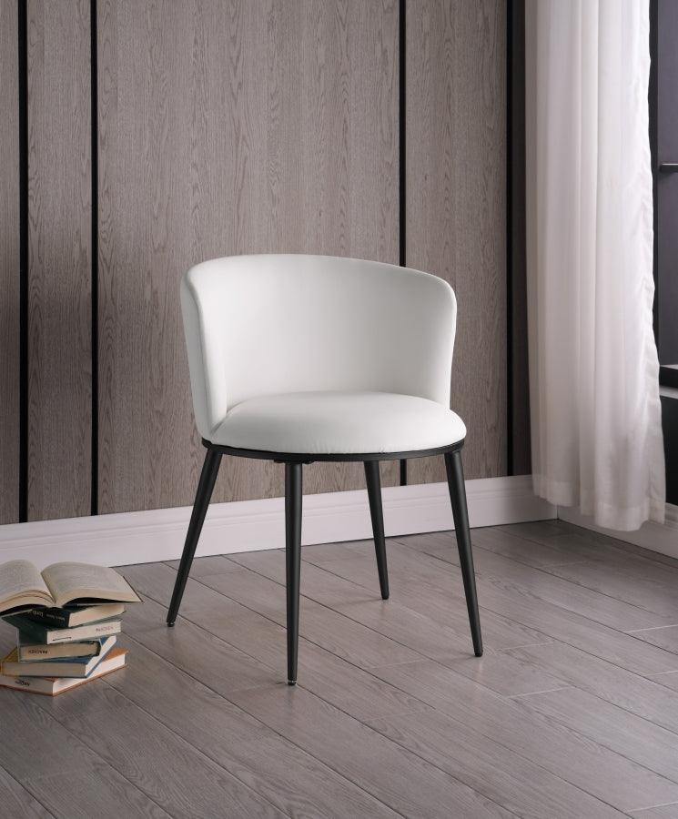 Enhance your décor with the Skylar white faux leather dining chair, due to its petite silhouette and artistic style. A soft round cushion and gently curving cushioned back give this chair an ageless quality that belies its contemporary design. A matte black base is supported by four tapering legs, and it weighs only 11 pounds overall. Easily paired with any of several available tables, this chair is equally well-suited to use in a conversation grouping.