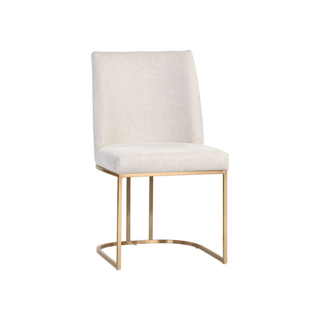 An elegant cantilever dining chair designed with soft, textured belfast oatmeal fabric and an exposed antique brass stainless steel frame. Can be paired with coordinating dining armchair and bench.