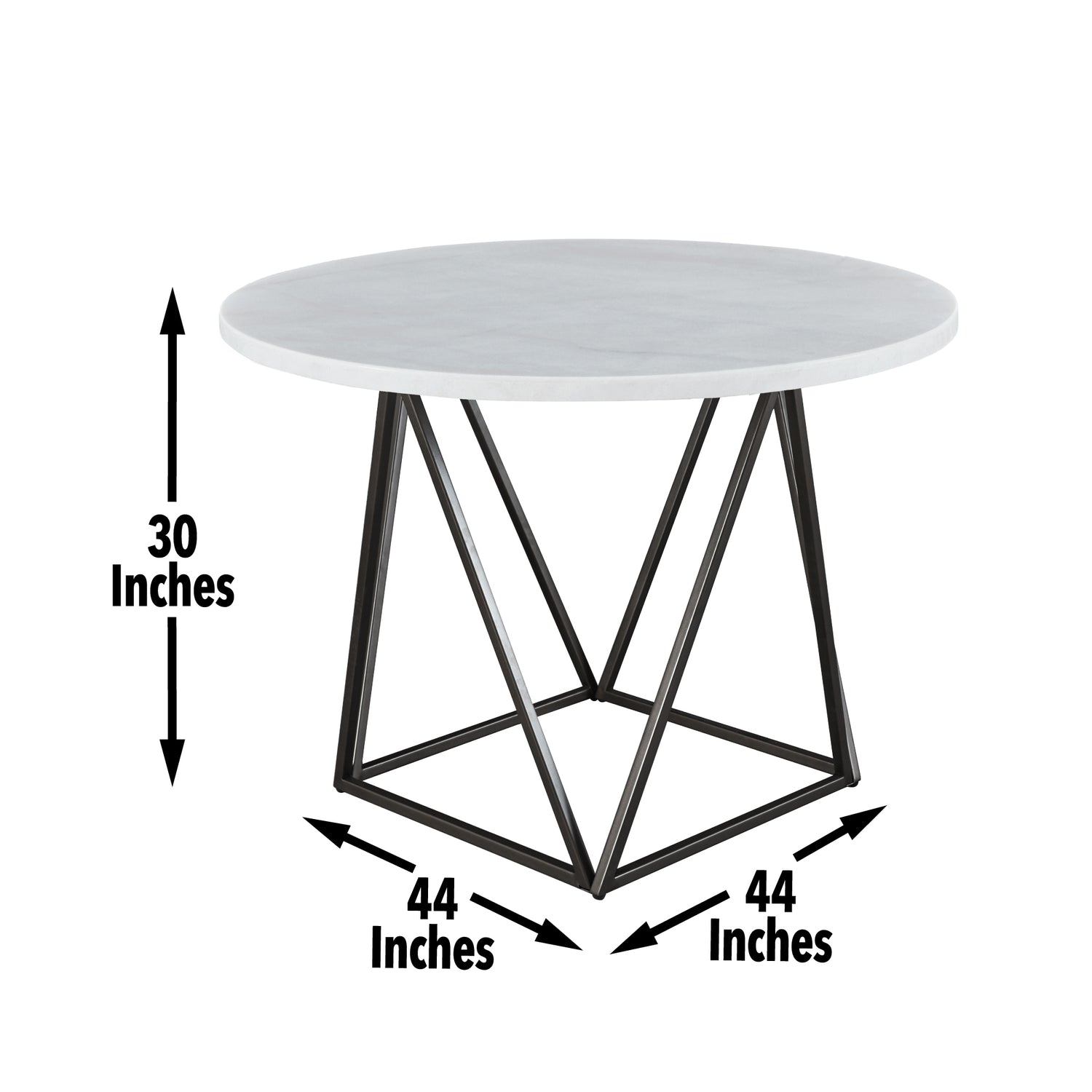 - Table styling features include beautiful round white marble top combined with a powder-coated dark bronze iron base with architectural angles