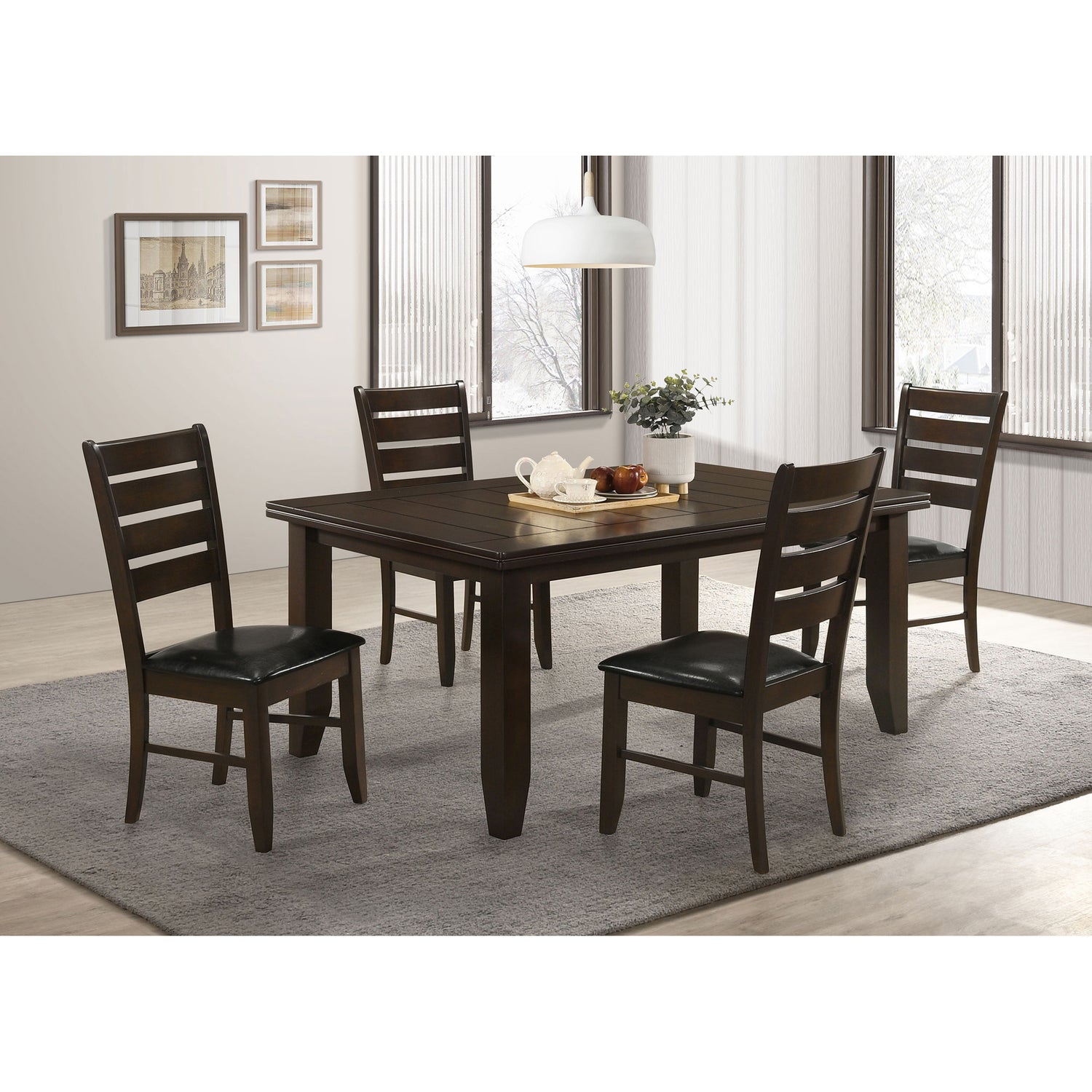 - Elegant dining set features a plank-style table paired with coordinating chairs, creating a cohesive and stylish dining environment