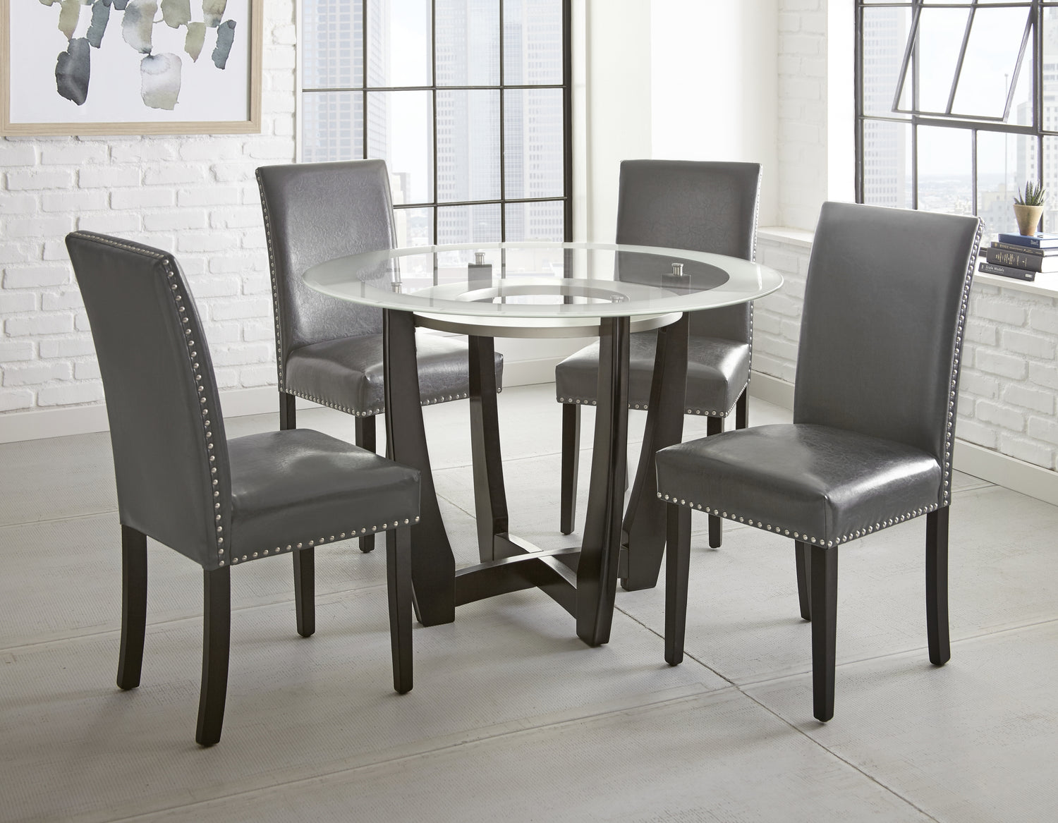 - Set includes 45-inch Round Glass Top Dining Table & 4 Grey Side Chairs