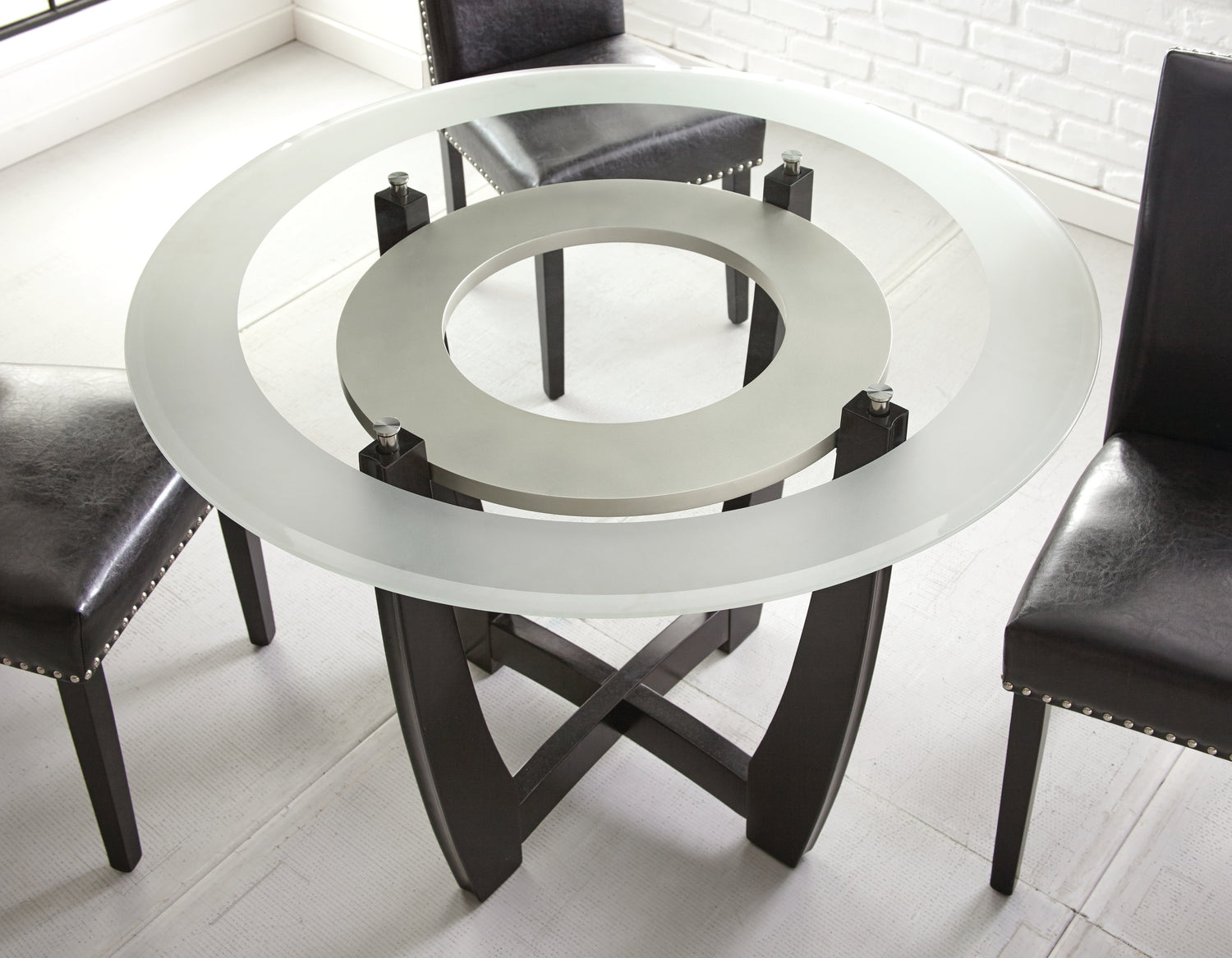- Styling details include a table top constructed from 10 mm tempered glass with 5” frosted perimeter and 1” beveled edge