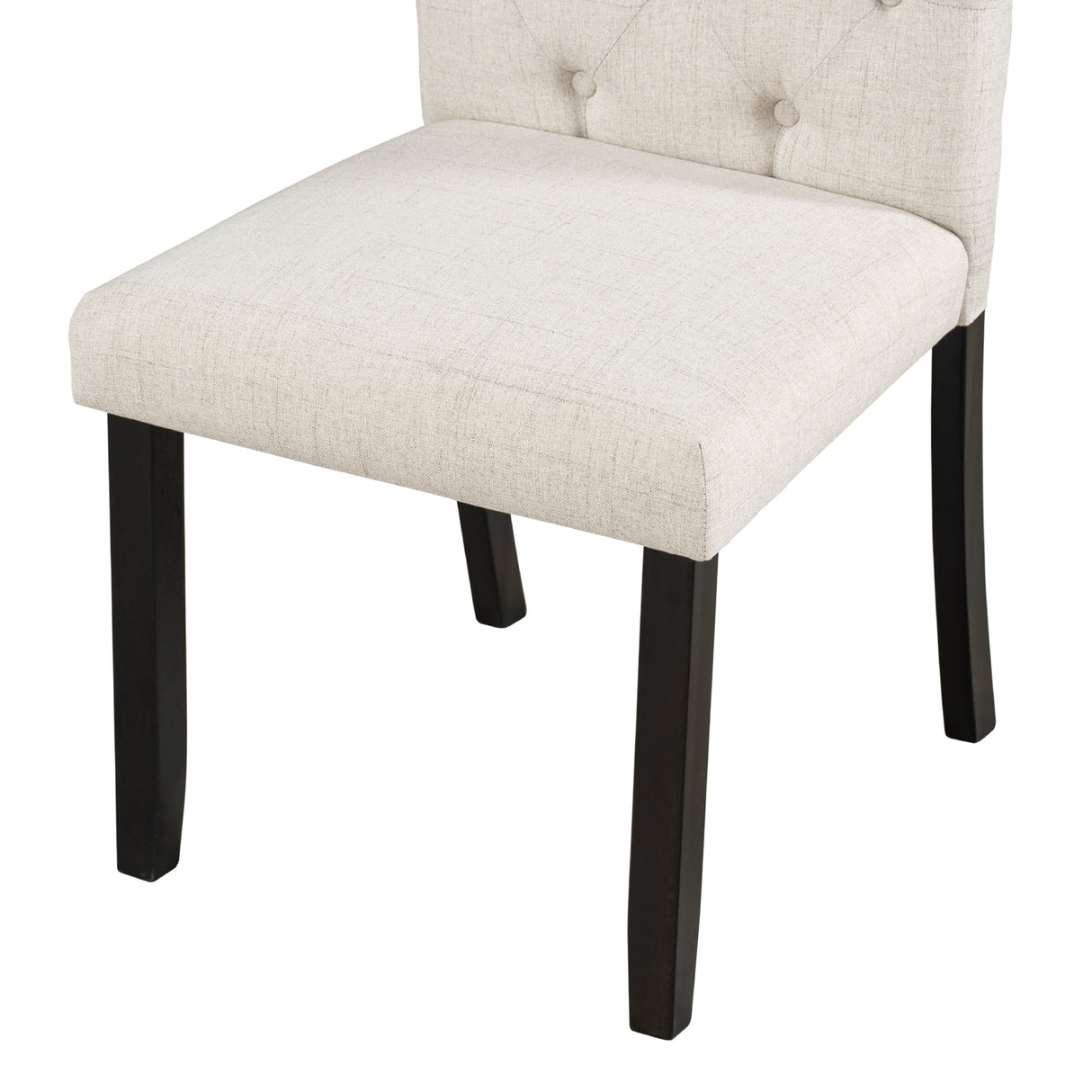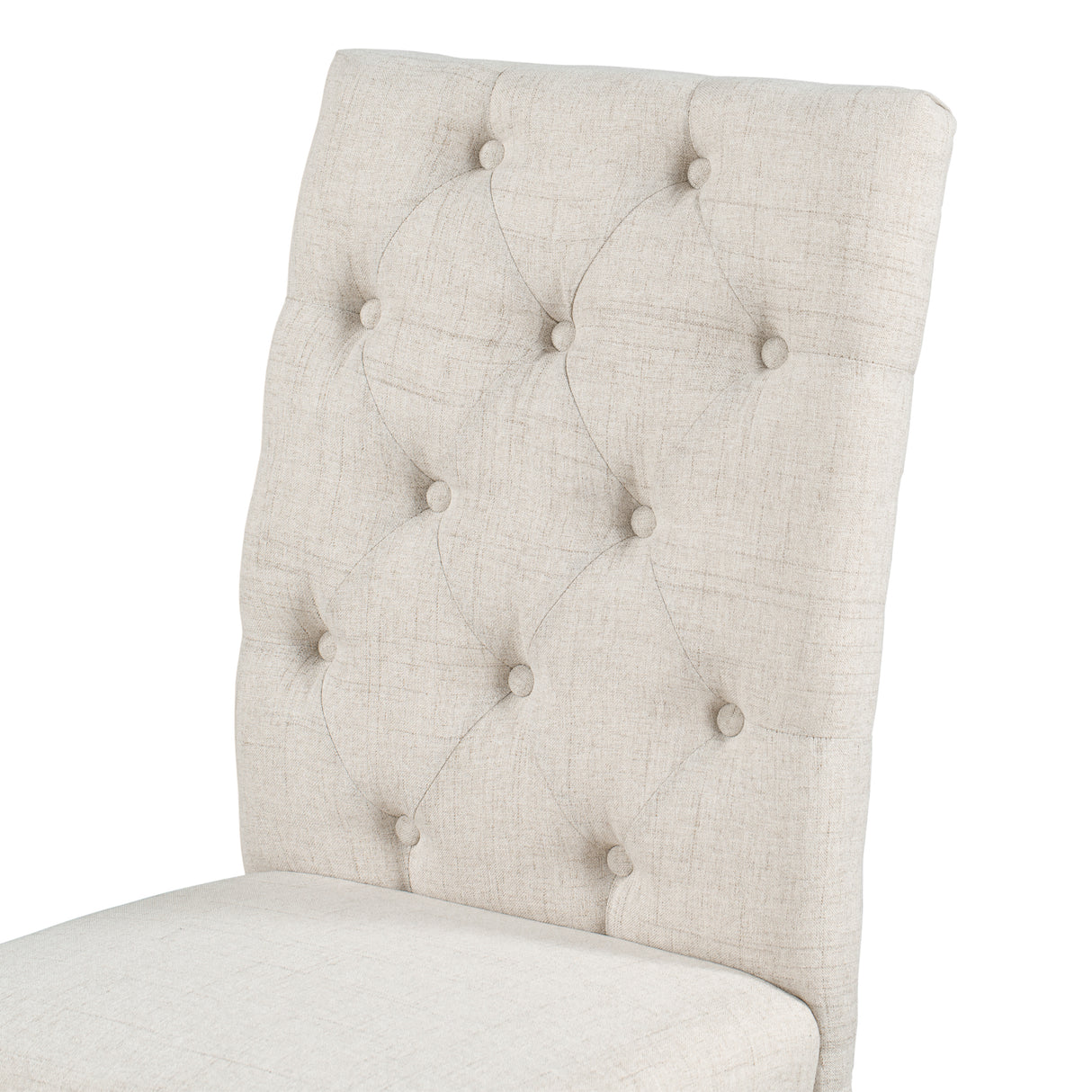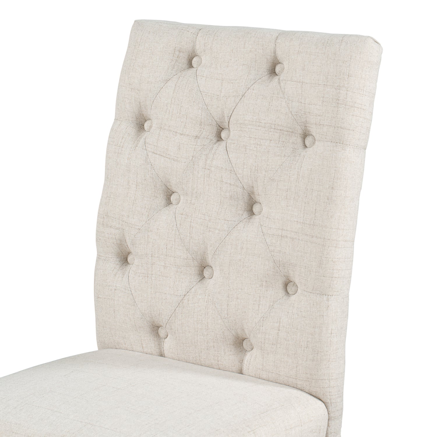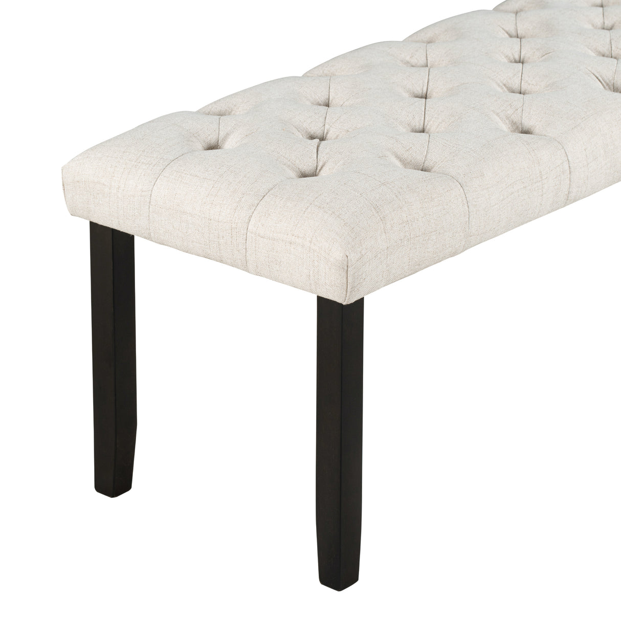 The chairs showcase high backs, linen upholstered seats, and button-tufting for a classic look. The chair's ergonomic curved back and 4.3" thickness soft cushion, matching a 48" length bench, provide a comfortable experience in daily usage. The load-bearing capacity of chair and bench are 250lbs.