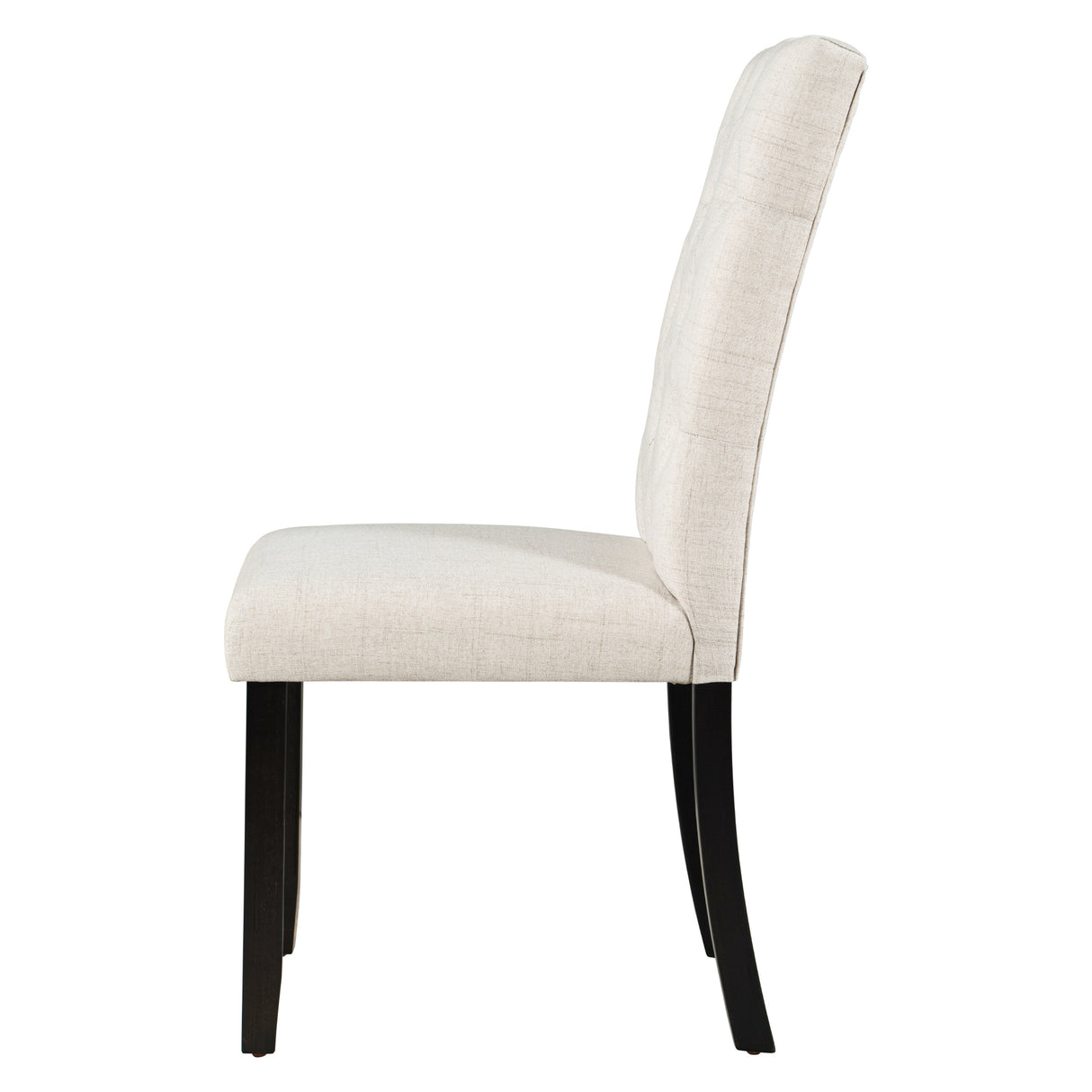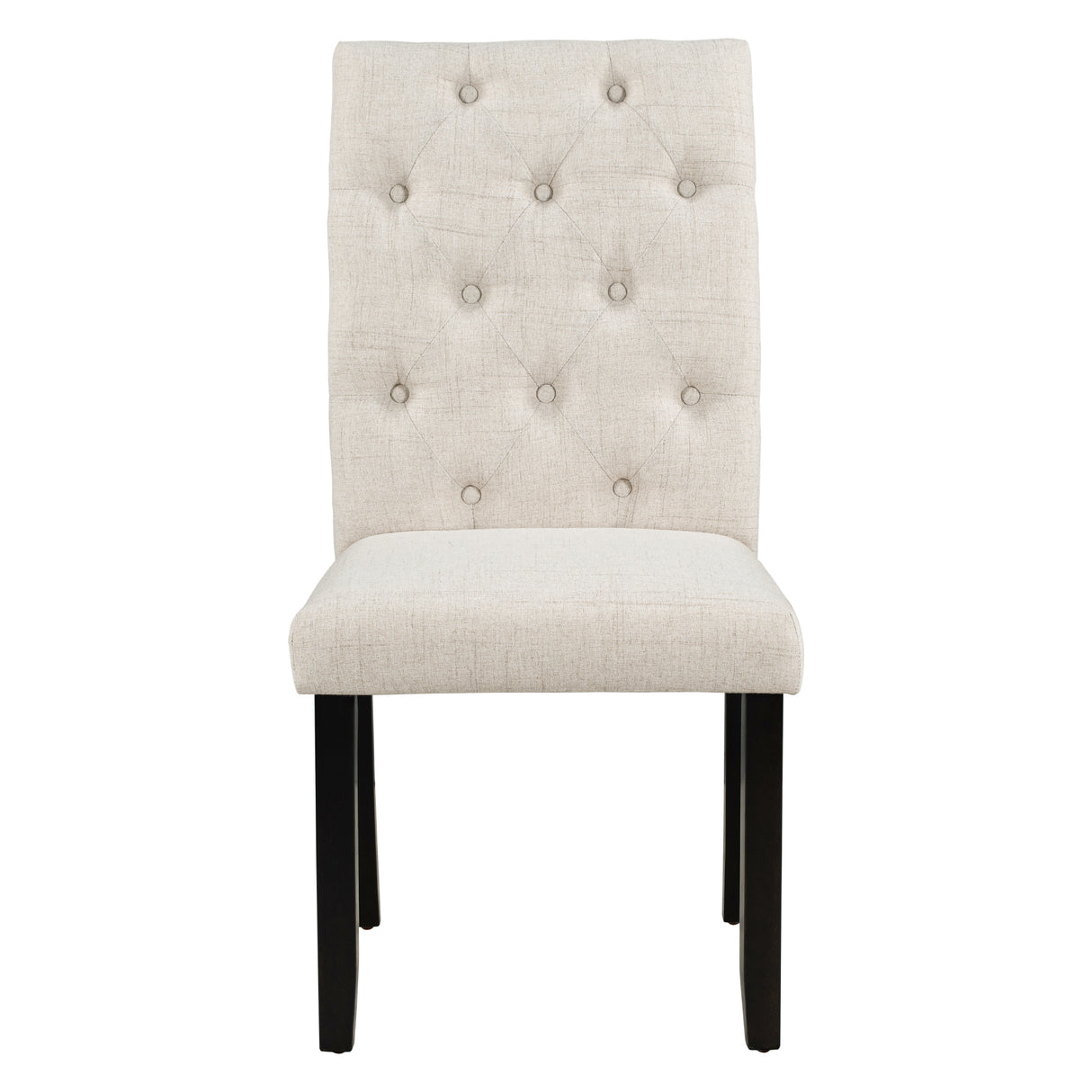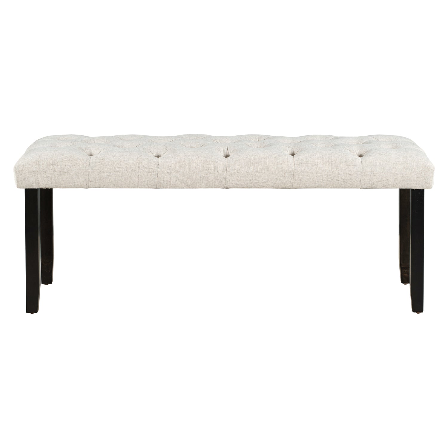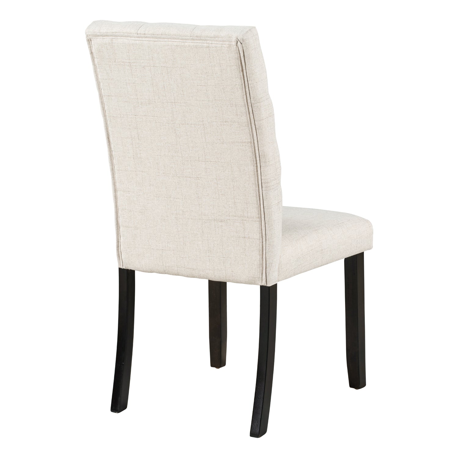 The chairs showcase high backs, linen upholstered seats, and button-tufting for a classic look. The chair's ergonomic curved back and 4.3" thickness soft cushion, matching a 48" length bench, provide a comfortable experience in daily usage. The load-bearing capacity of chair and bench are 250lbs.
