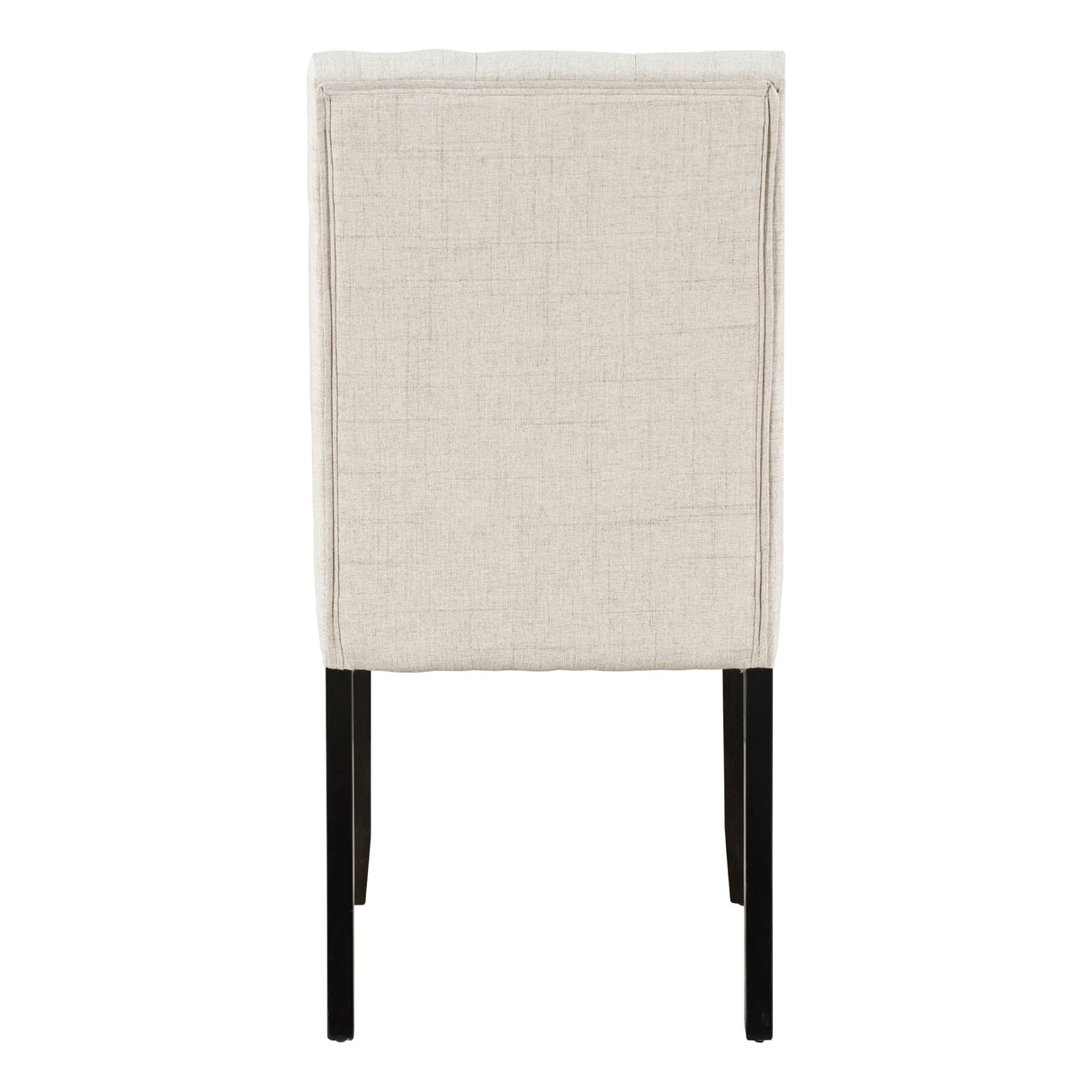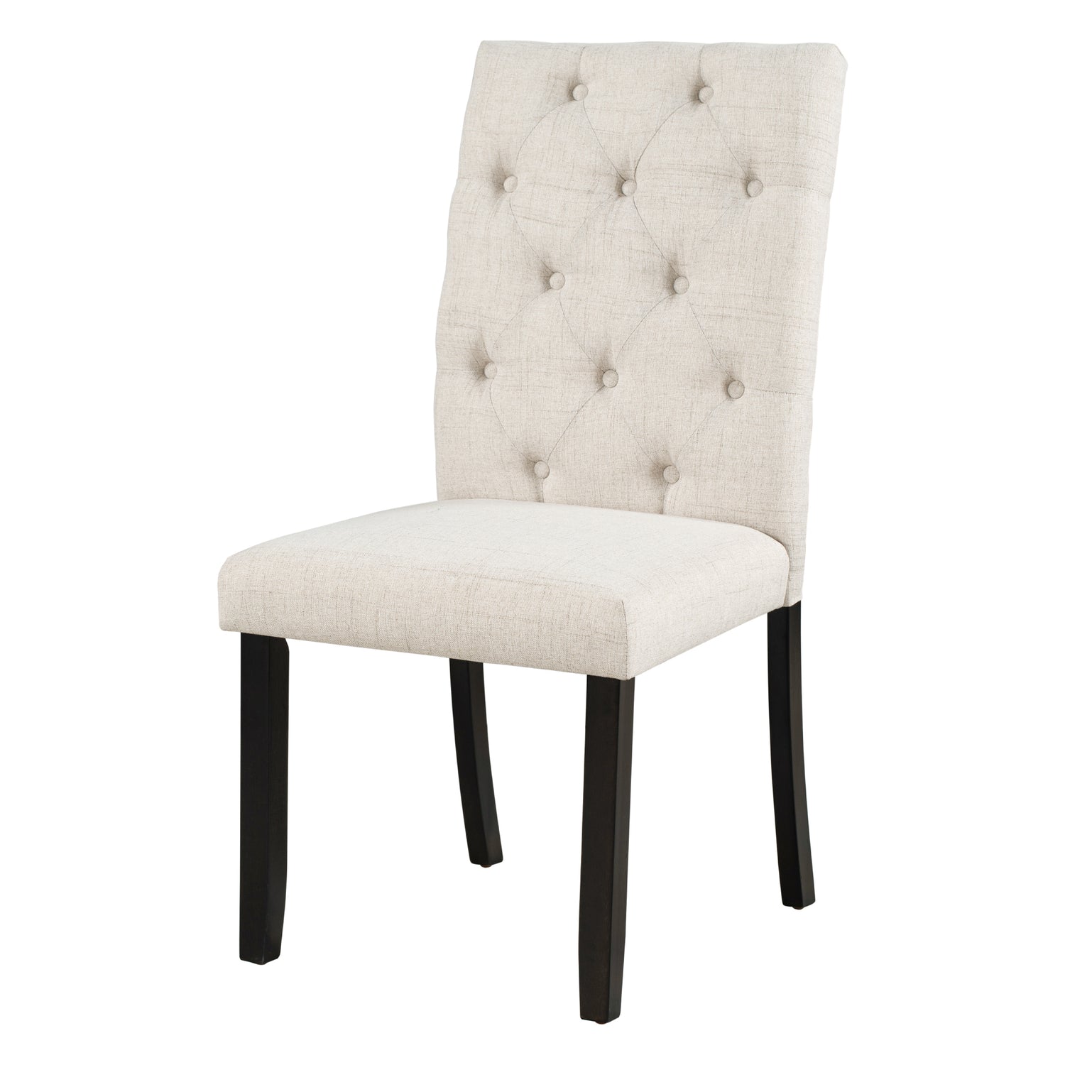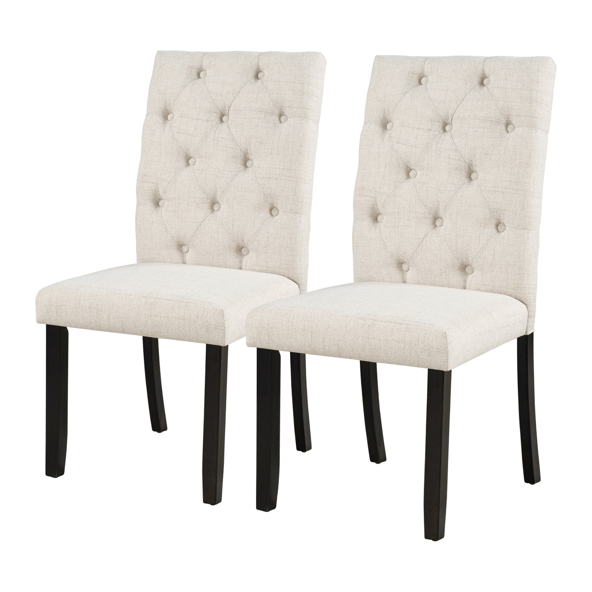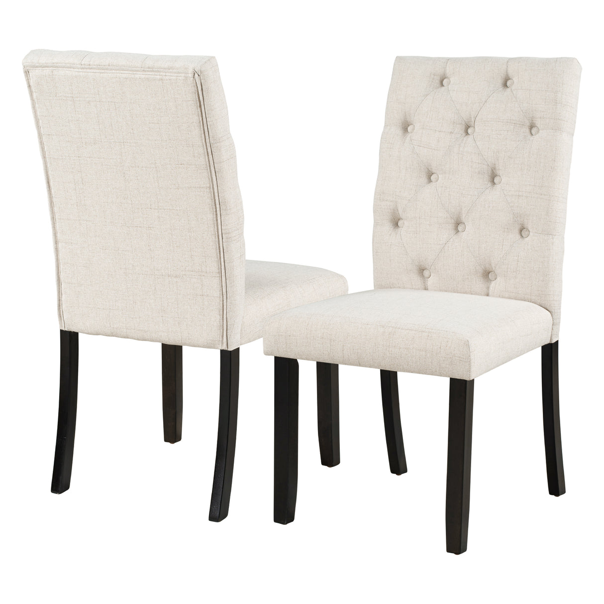 The chairs showcase high backs, linen upholstered seats, and button-tufting for a classic look. The chair's ergonomic curved back and 4.3" thickness soft cushion, matching a 48" length bench, provide a comfortable experience in daily usage. The load-bearing capacity of chair and bench are 250lbs.