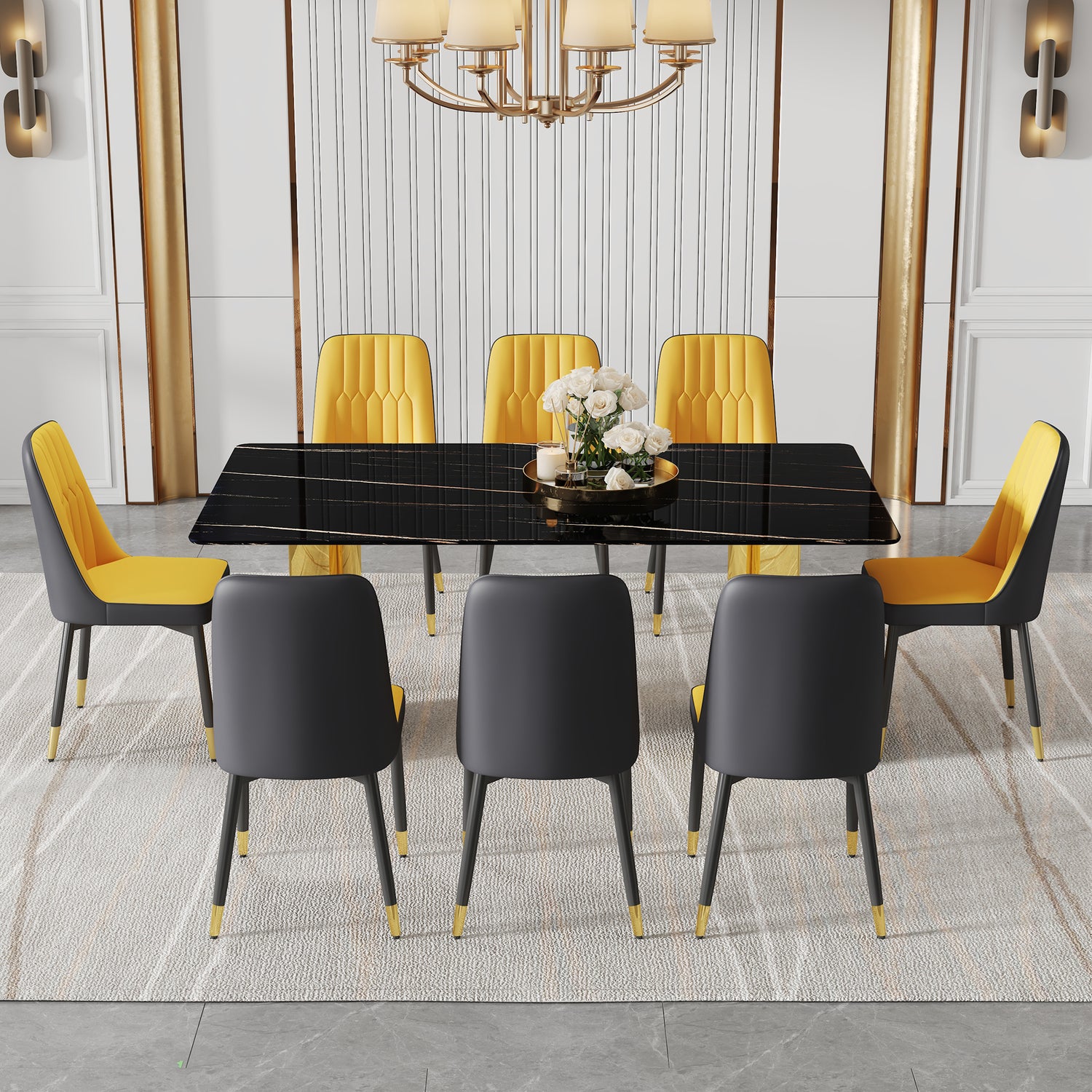Table and chair set.The table has a glass top with imitation marble pattern stickers and stainless steel golden legs. Paried with 8 Orange and Dark Gray Spliced Color PU Dining Chairs.