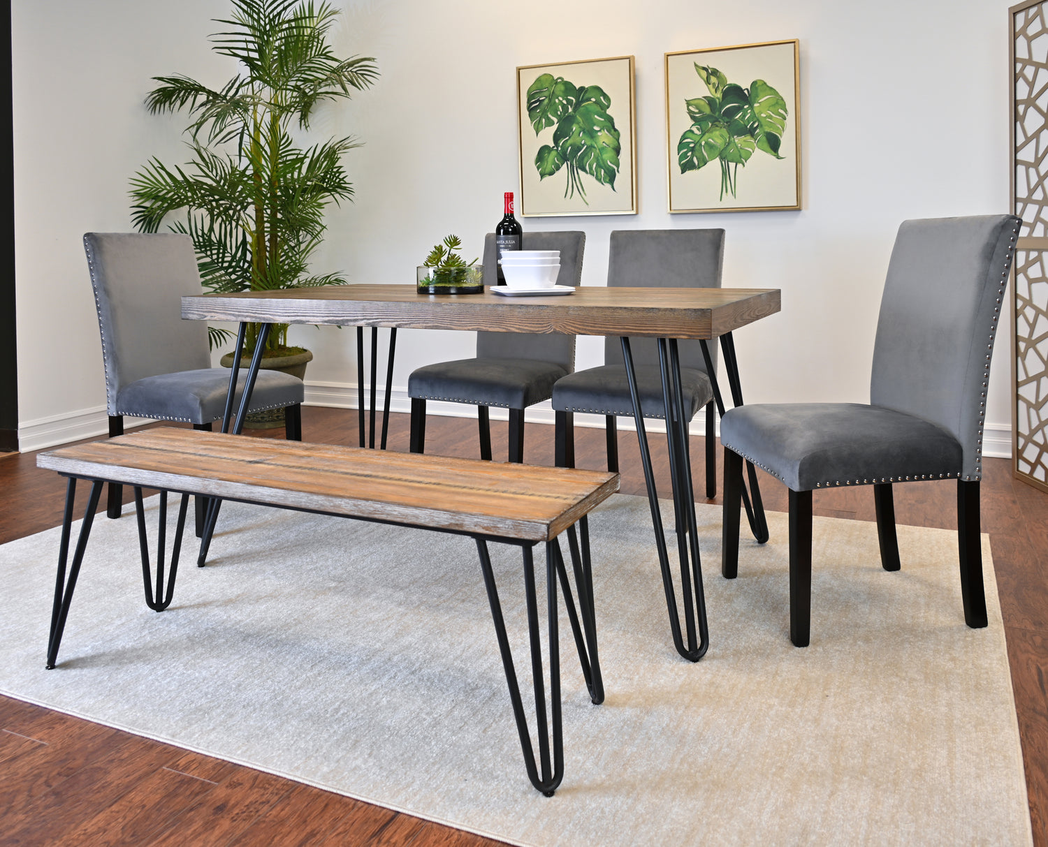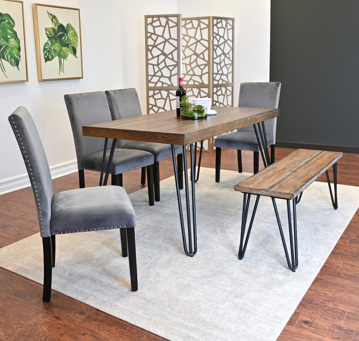 Enhance your dining experience with the Ashzo 6-Piece Dining Set. Crafted with meticulous attention to detail, this set effortlessly combines style and functionality for an exceptional dining arrangement. The set includes a spacious dining table, four comfortable chairs, and a matching bench, providing ample seating for family and guests. Both the dining table and bench feature a rustic dark pine finish with a metallic hairpin design, showcasing a beautiful wood grain texture that is sure to impress your guests. Both table and bench top are constructed with durable engineered wood and is well-coated, ensuring long-lasting durability. The chairs, adorned with chrome nailhead trim on soft velvet upholstery, strike a perfect balance between elegance and comfort. Supported by a sturdy hardwood frame with rich dark espresso legs, these chairs offer lasting stability. Immerse yourself in contemporary design and lasting craftsmanship with the Ashzo Dining Set.