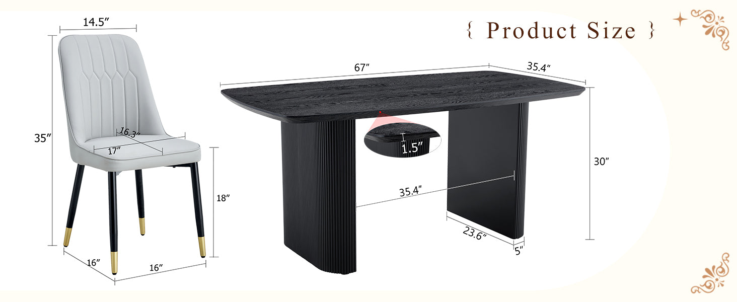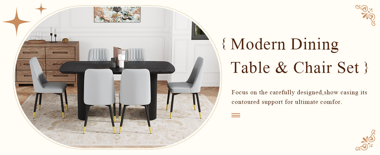 Table and chair set.67 * 35.4 inch black wood grain MDF dining table: a simple and luxurious, stable choice.Paired with 6 Light Gray chairs with PU cushions and black metal legs.