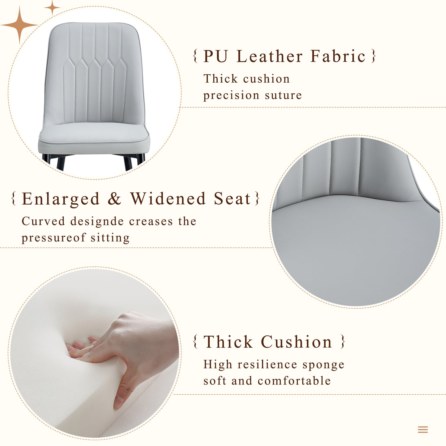 - Gold Spray Decoration: The lower part of the chair legs near the ground is decorated with gold spray, adding a touch of luxury to the design.Anti-slip Floor Feet: Considering the safety and stability of use, the bottom of the chair legs is specially equipped with anti-slip floor feet, protecting the floor and ensuring the stability of the dining chairs during use.