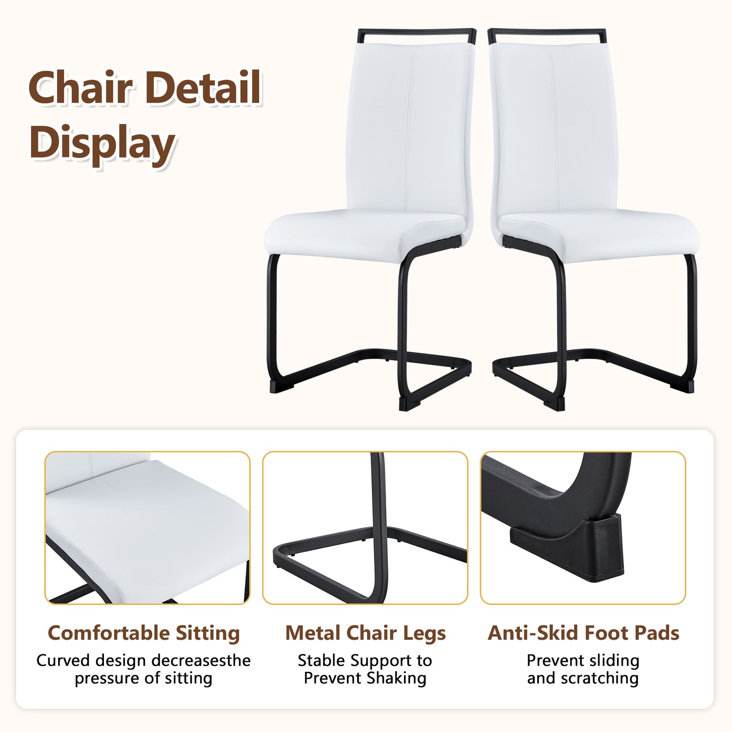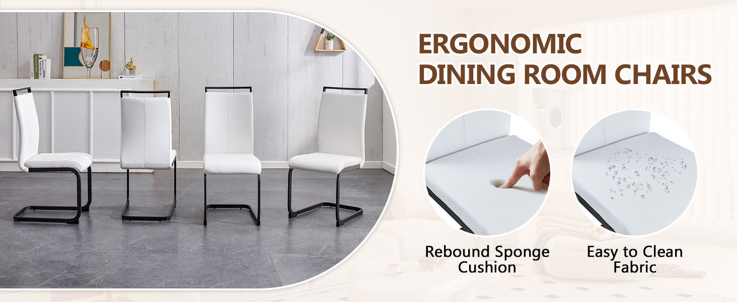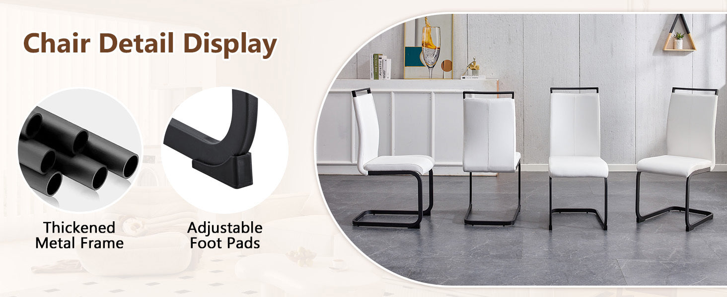 - The accompanying chairs are designed in white color, with black metal chair legs, simple yet luxurious.High-quality PU seats, soft and comfortable. The PU seat cushion has good elasticity and softness, providing a comfortable sitting experience and is suitable for long-term use. At the same time, PU material is wear-resistant, age-resistant, and easy to clean.