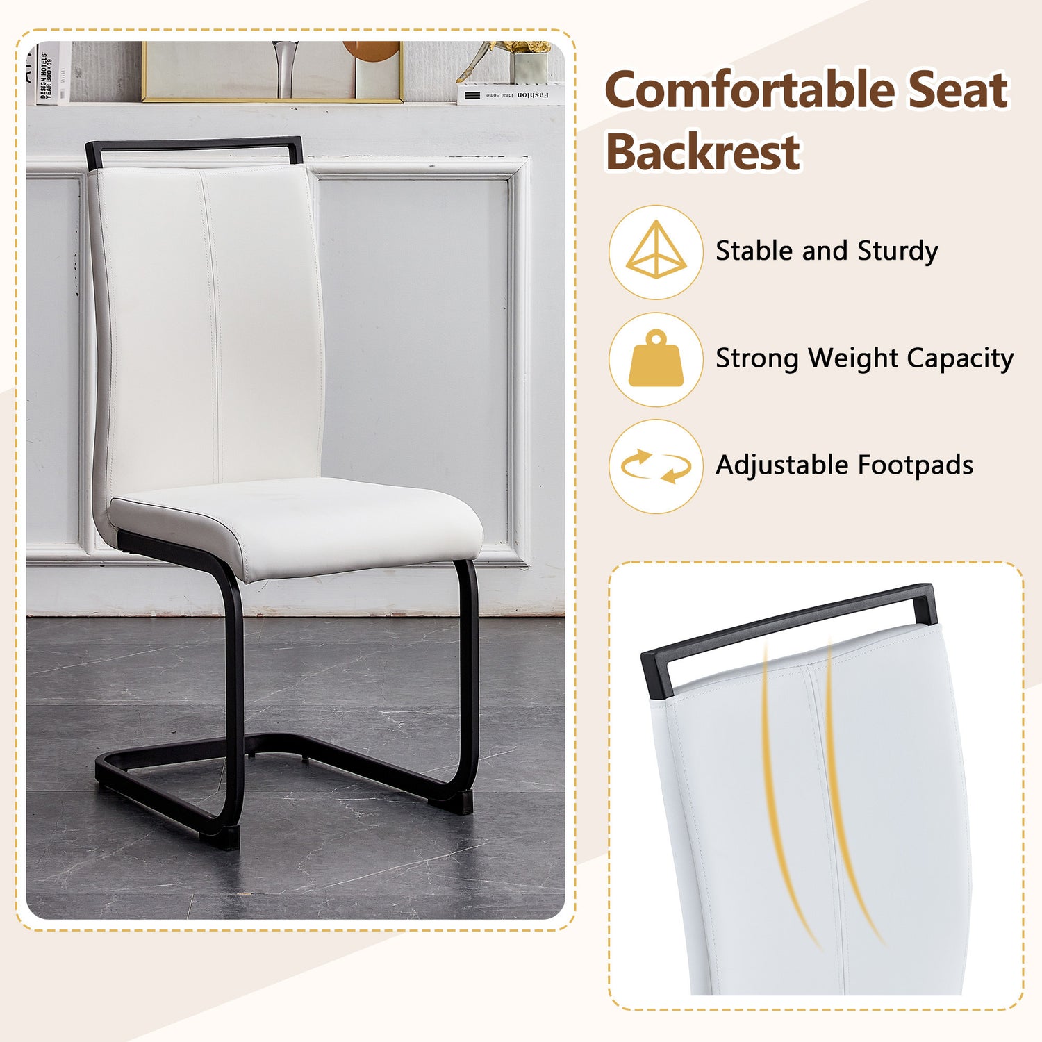 - Stable Arched Metal Legs: The black arched metal legs not only add a sense of design but also provide strong support, ensuring the stability and durability of the chair.Anti-Slip Protective Feet: The anti-slip feet design at the bottom of the chair legs protects the floor from scratches and increases the safety of the chair during use.