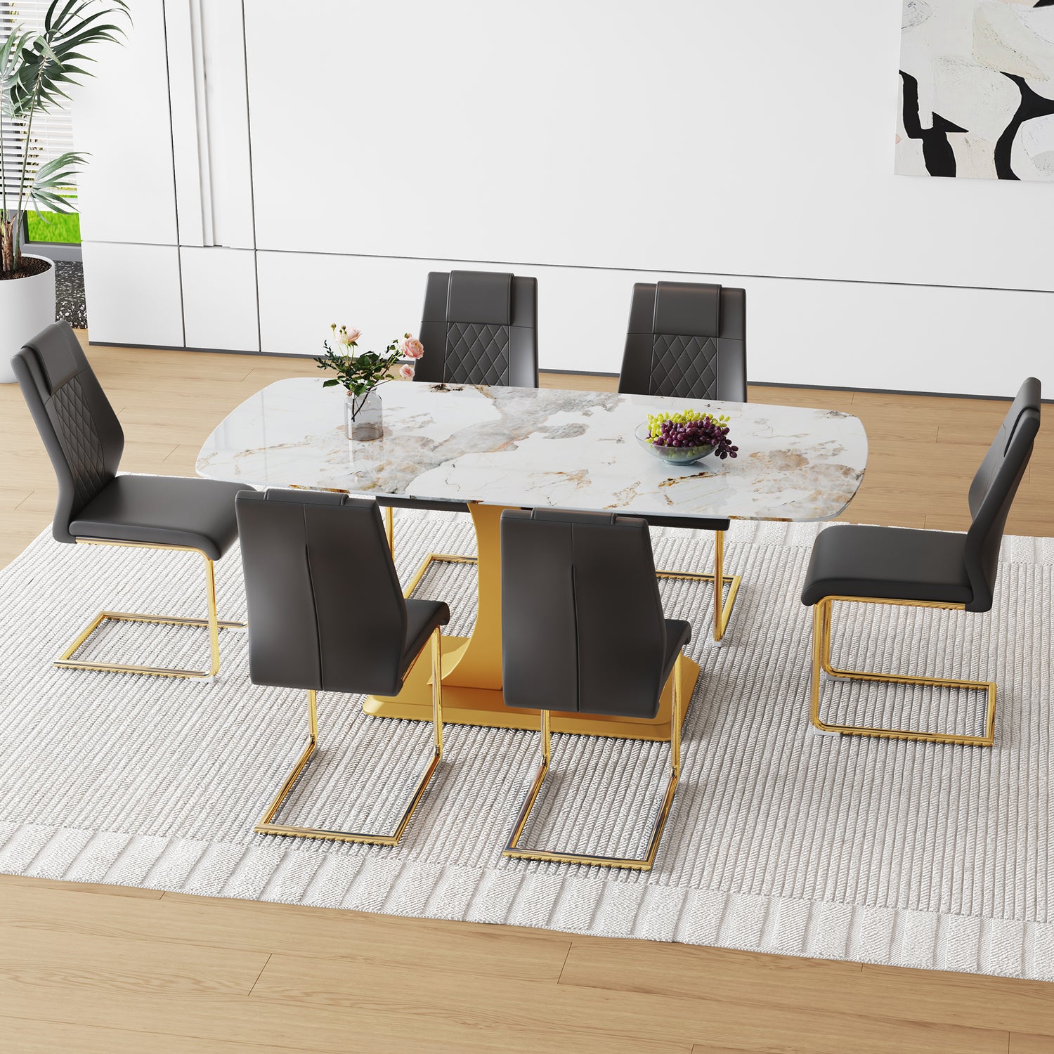 Table and chair set.71'x35.4'x30' Luxurious Pandora Patterned Glass Dining Tabletop with Golden Back To Back C-Shaped MDF Legs.Paried With 6 Black High-quality PU Chairs With Arched Metal Legs. is available