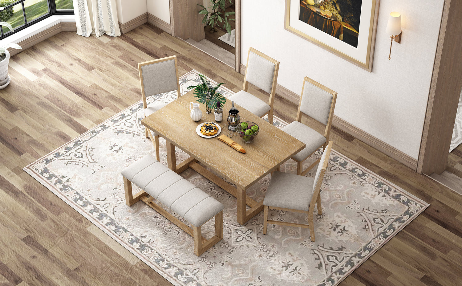 - Vintage Dining Table Set: This dining table set for 6 comes with a spacious table, four beautifully crafted chairs and a versatile bench, creating a warm sophistication for all your mealtime get-togethers. Its elegant design, high-quality construction, and versatile seating options make this dining table set for 6 a perfect choice for you. Available in two colors, natural and gray, you can choose whatever the color of the dining table set for 6 with chairs that best complements your home decor.