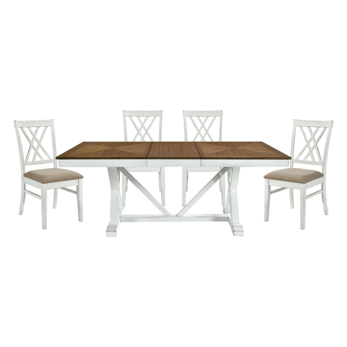 PRODUCT FEATURES: - • Country of Origin: Malaysia • Made of ash veneer, wood and engineered wood • 2-tone finish (Oak and White) • Self-storing butterfly extension leaf • Textured fabric upholstery • Double cross chair back • Fabric Type: Textured • Fabric Color: Khaki • Fabric Content: 100% polyester • Fabric Cleaning Code: Upholstery (S) PRODUCT DESCRIPTION: - As inviting as a country kitchen, the Brunson Collection’s charming design is a blend of traditional lines and casual comfort, creating the perfect arrangement for your casual dining room. The two-tone white and oak finish over oak veneer is the perfect canvas for your modern farmhouse décor. The double x-back wood-framed side chairs feature neutral tone fabric seats for complementing contrast to the collection’s finish. A self-storing butterfly leaf allows for quick tabletop expansion. PRODUCT DIMENSIONS: - Dining Table: 42" x 59.5" - 77.5" x 30.5"H Apron to floor: 26.5" Length of leaf: 18" x 1 Side Chairs: 19" x 23.5" x 38.5"H Seat Width: 19" Seat Depth: 18" Seat Height: 19.5" Listing Includes: - 5pc Dining Set (1 Dining Table and 4 Side Chairs) Only. Simple Assembly Require.Payment & Security