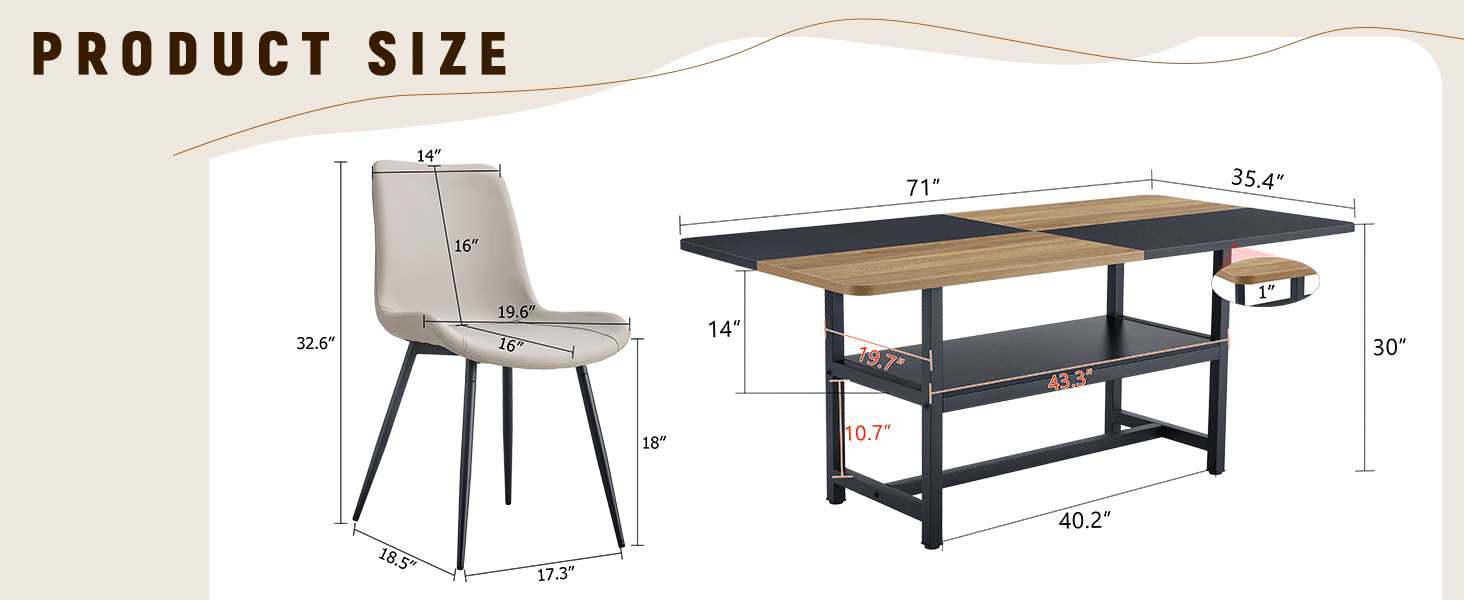 - Unique desktop: The desktop is made of MDF material, cleverly spliced with wood color and black to create a vivid visual contrast. The 1-inch thick tabletop not only has a rich texture, but also effectively resists scratches and wear during daily use, and is easy to clean.