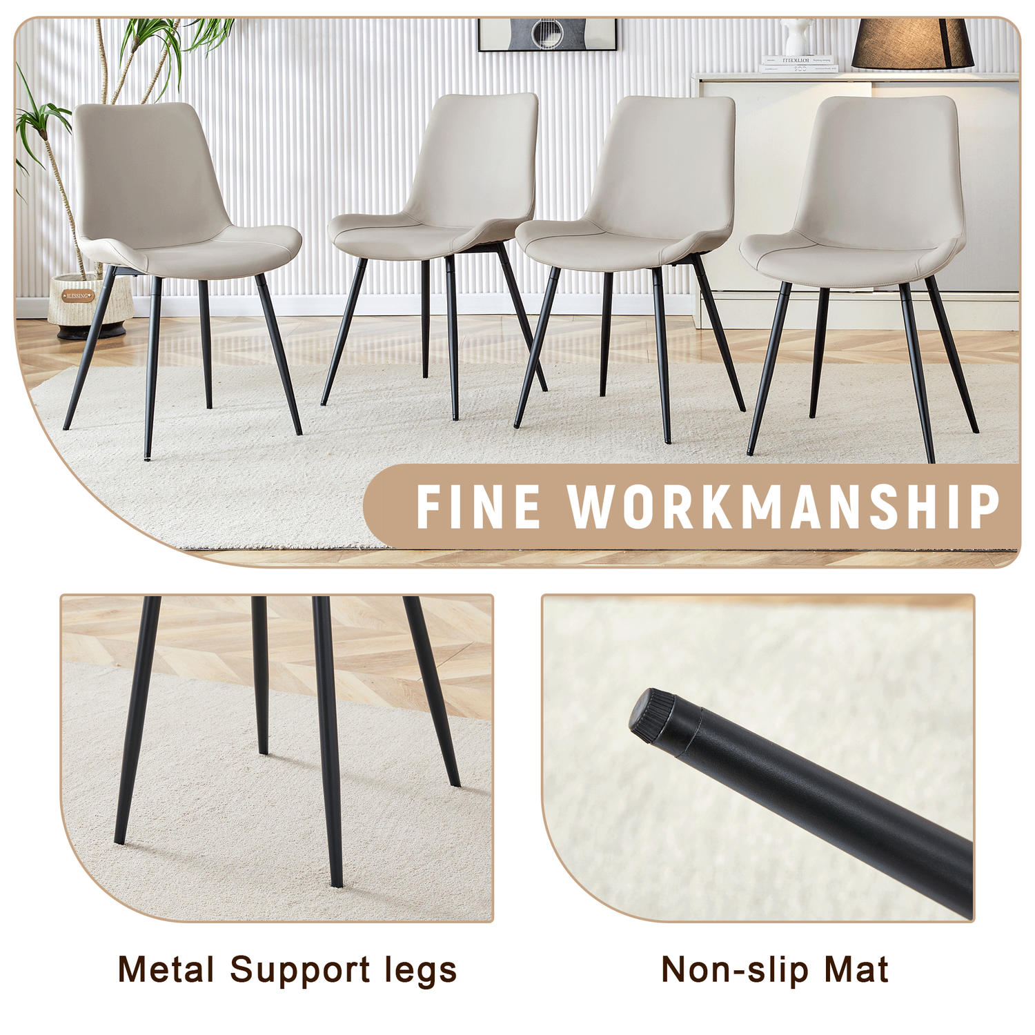 - Black Metal Chair Legs: The chairs have black metal legs that echo the black legs of the dining table, creating a harmonious look.Non-slip pads on the bottom of the chairs legs prevent scratching your beautiful carpet and floor, ensure stability.