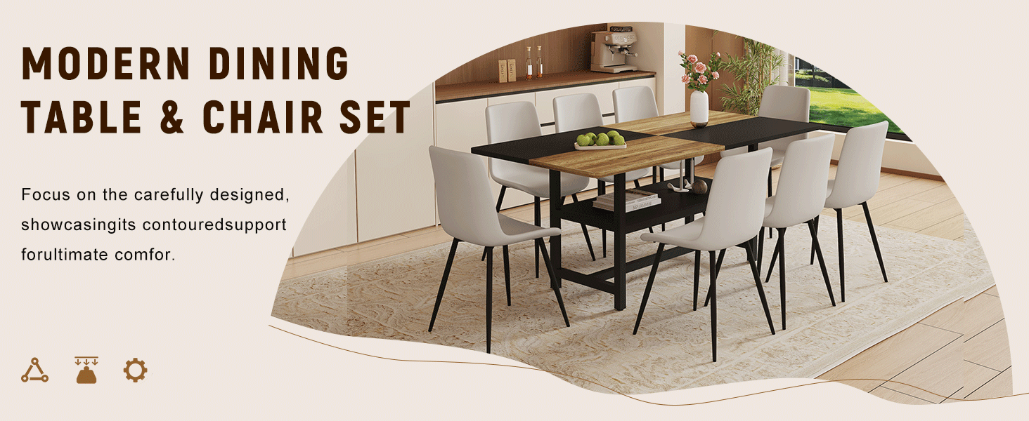 Table and chair set.71*35.4 inch Wooden And Black Spliced Dining Table With Storage Function In The Middle Of The Table Legs.Paired With 8 Warm Light Gray PU Chairs With Curved Widened Cushion Design. is available
