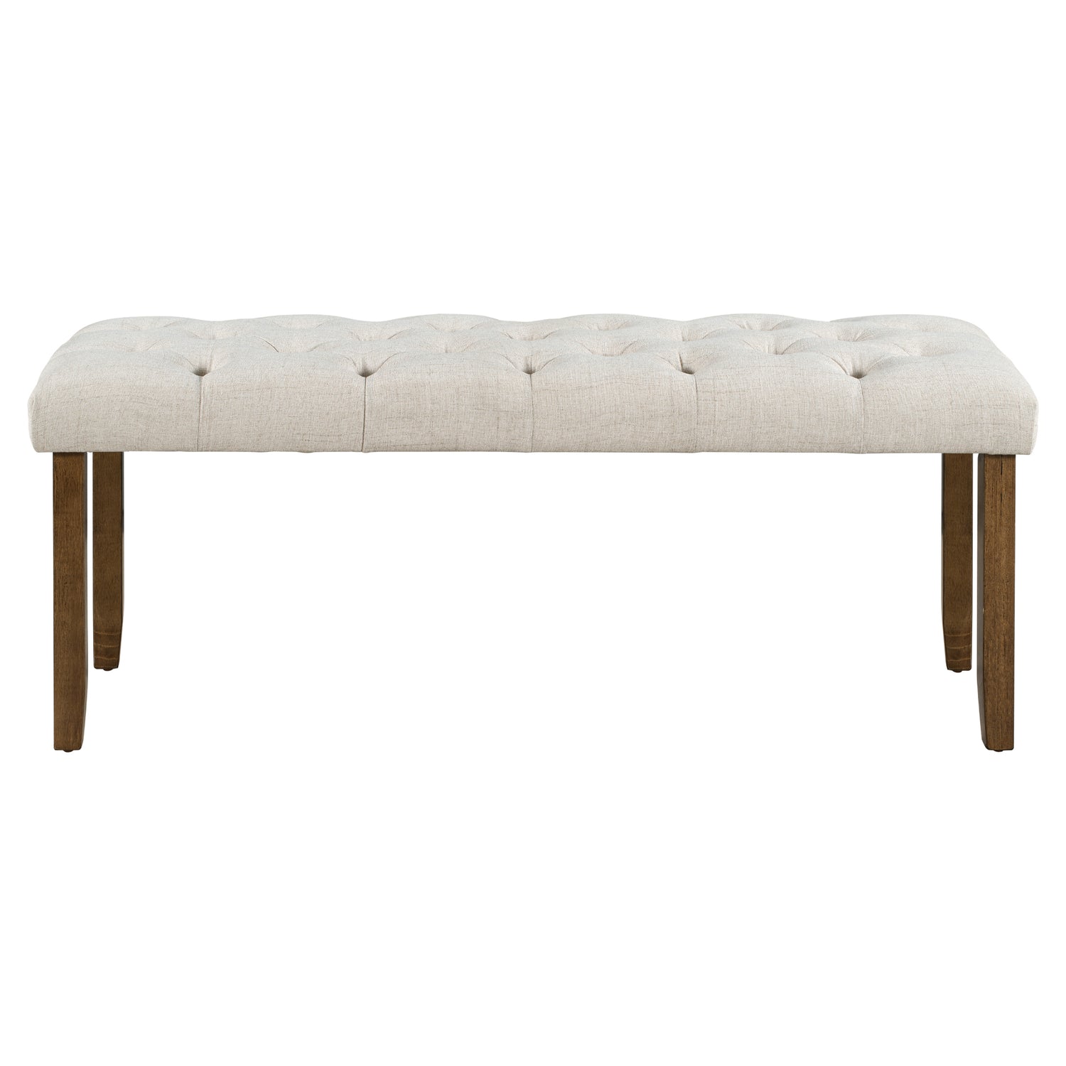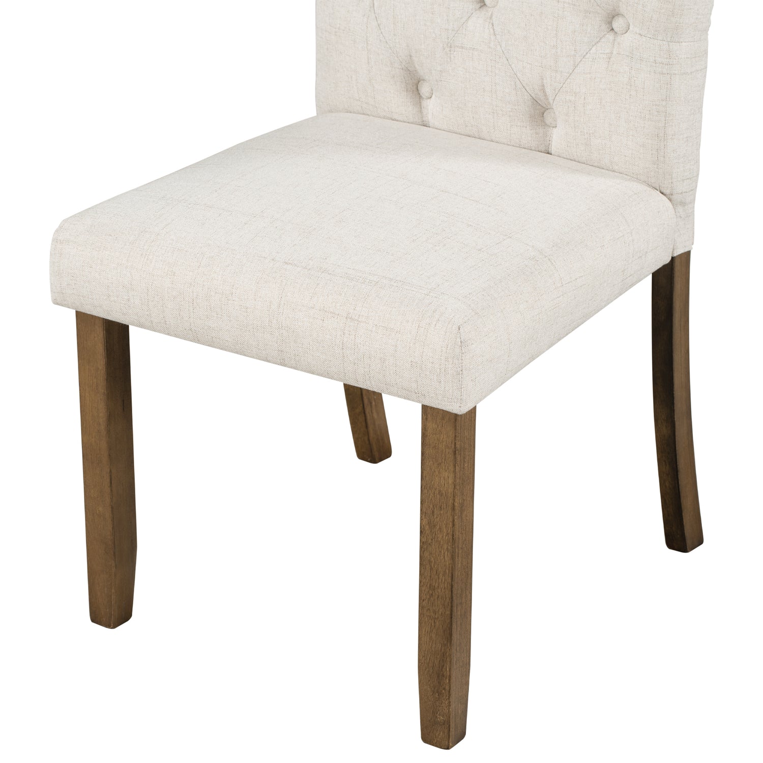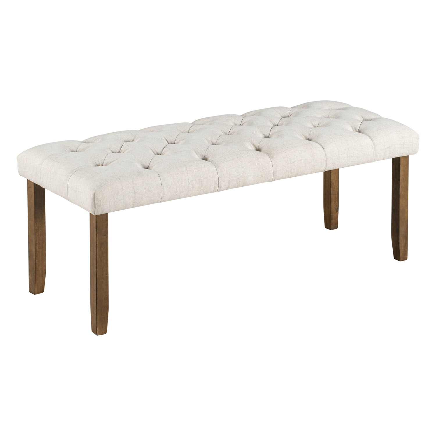 The chairs showcase high backs, linen upholstered seats, and button-tufting for a classic look. The chair's ergonomic curved back and 4.3" thickness soft cushion, matching a 48" length bench, provide a comfortable experience in daily usage. The load-bearing capacity of chair and bench are 250lbs.