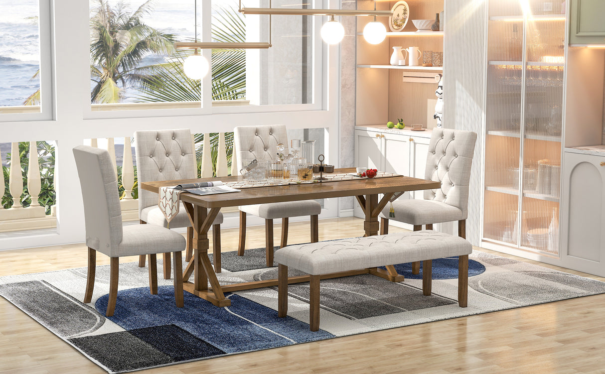 TREXM 6-Piece Farmhouse Dining Table Set 72" Wood Rectangular Table, 4 Upholstered Chairs with Bench (Walnut) is available