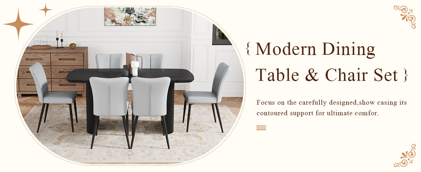 Table and chair set.67*35.4 inch black wood grain MDF dining table:a simple and luxurious choice.Paired with 6 Light Gray PU chairs with a vertical stripe design on the backrest and black metal legs. is available