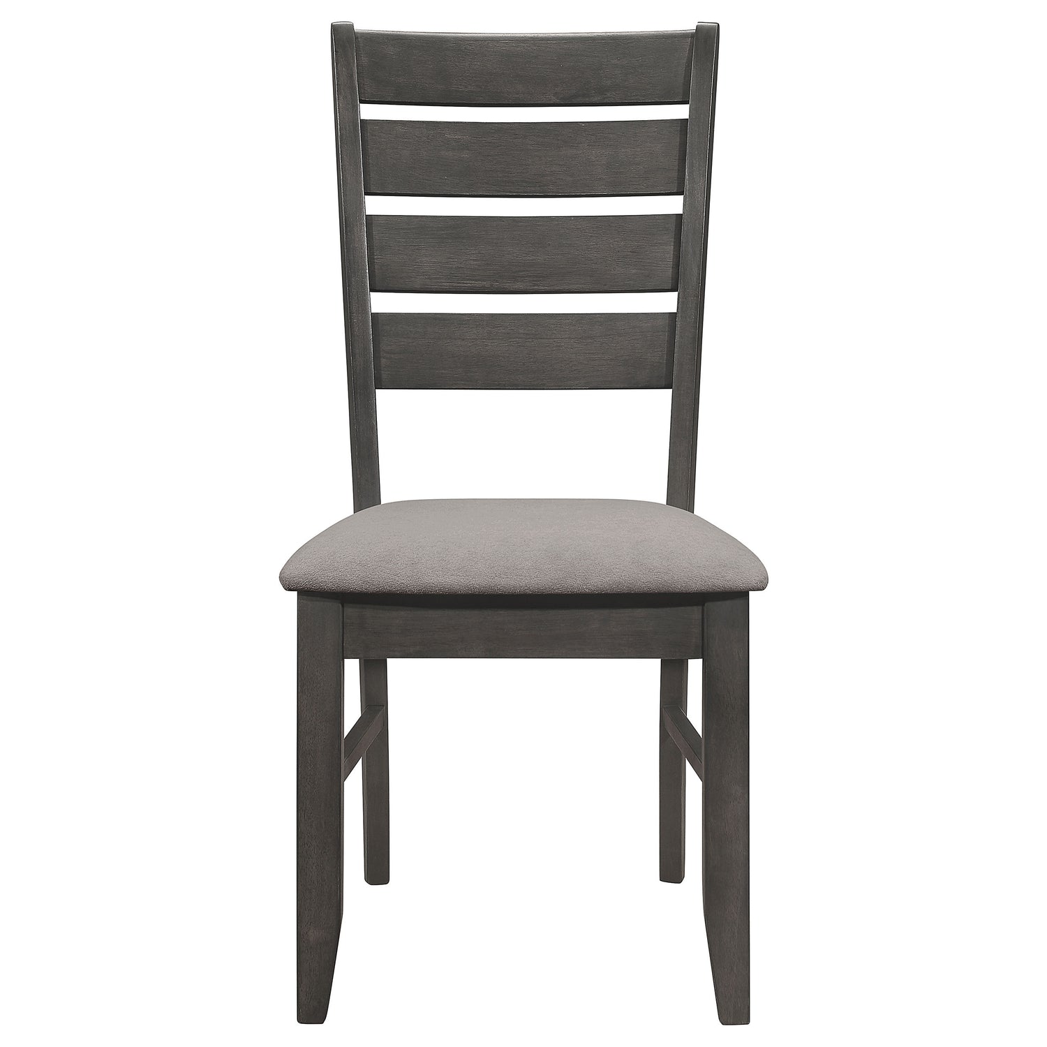 - Padded seats upholstered in soft grey fabric provide comfortable seating for extended dining experiences and gatherings