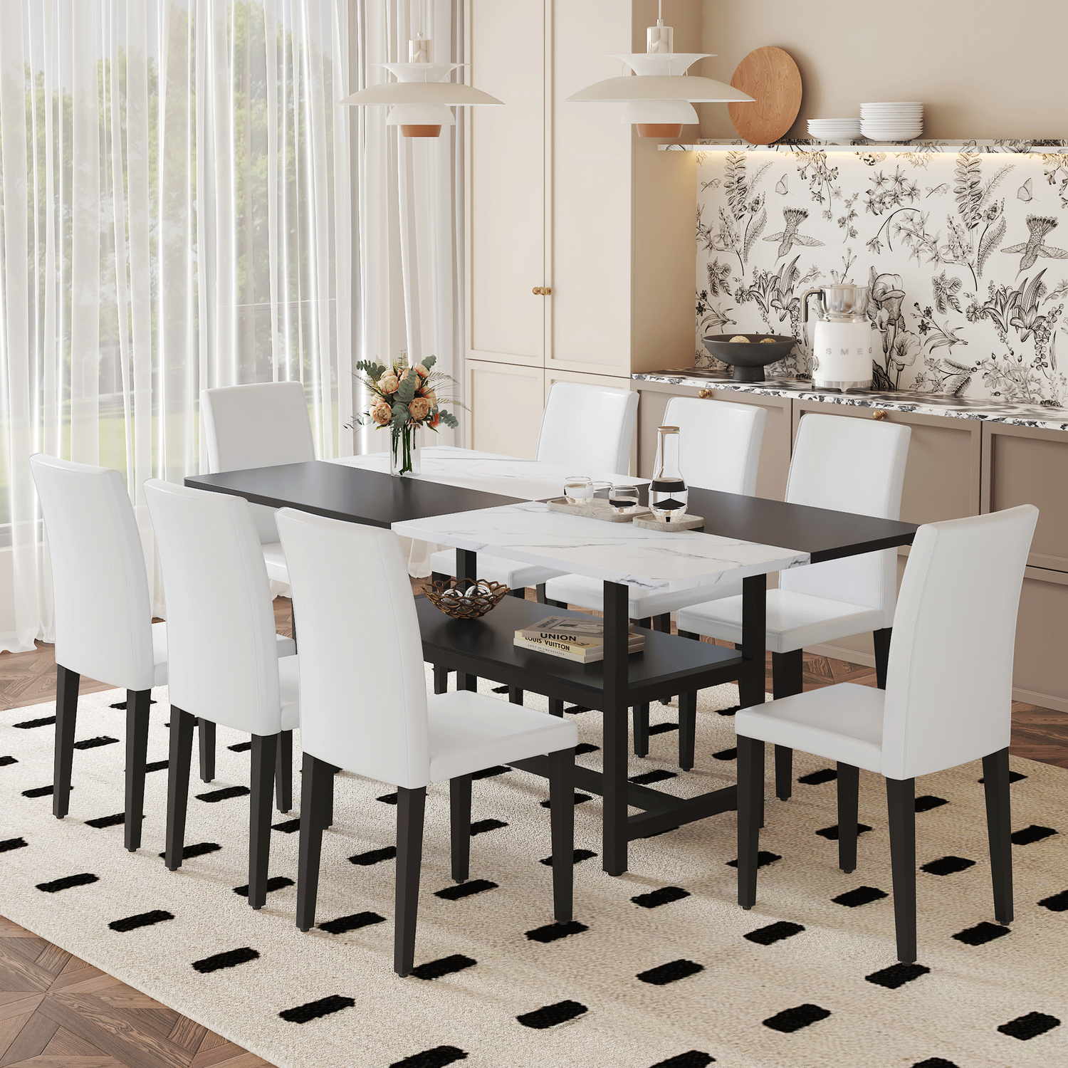 Table and chair set.71*35.4 inch White And Black Spliced Dining Table With Storage Function In The Middle Of The Table Legs.Paired With 8 White PU Dining Chairs, Simple And Versatile.