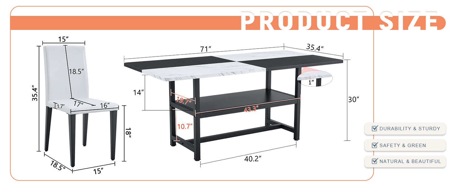 - Size adaptation: This dining table measures 71 inches in length, 35.4 inches in width, and 30 inches in height. With its grand specifications, it can easily accommodate multiple people dining at the same time, making it perfect for both family gatherings and friend parties.