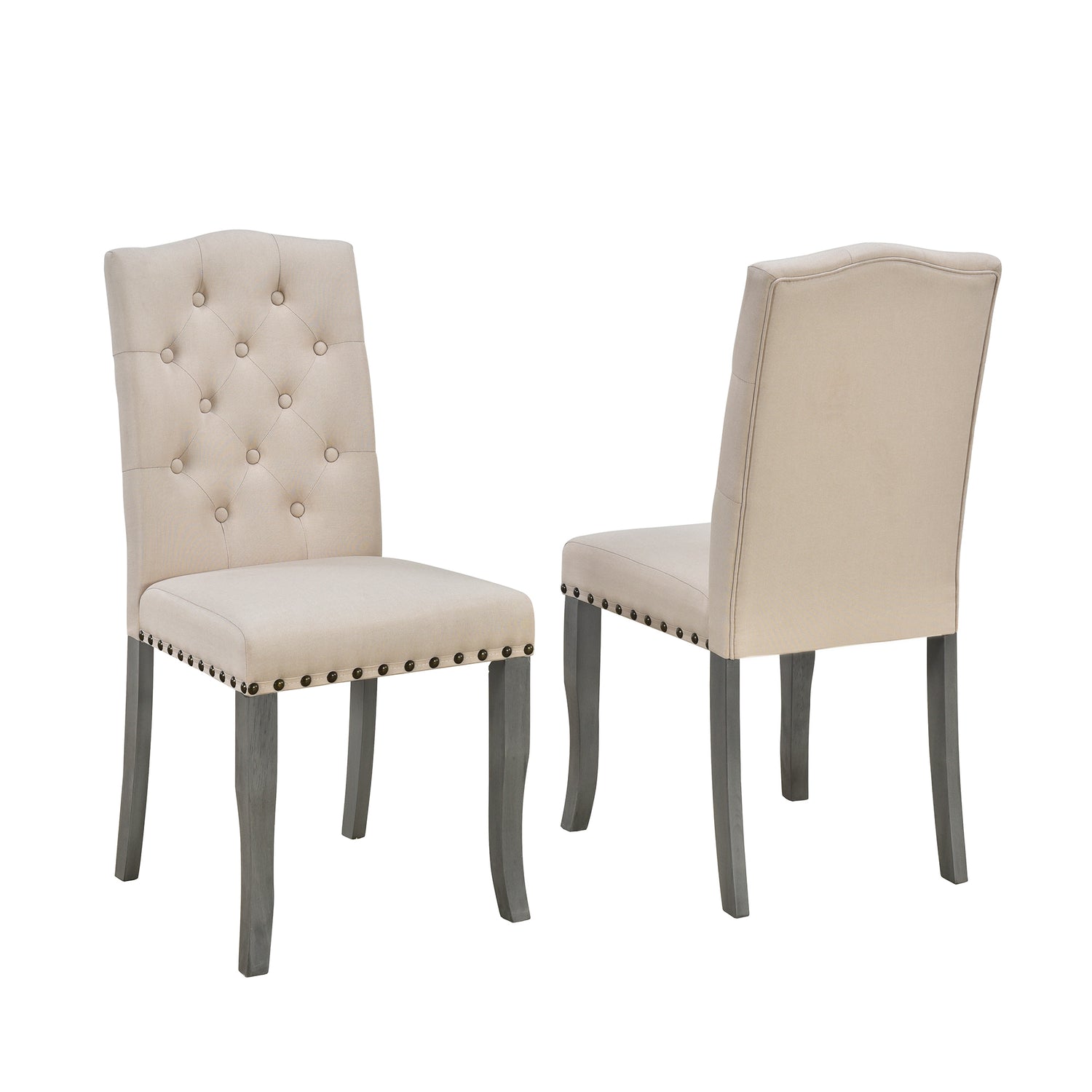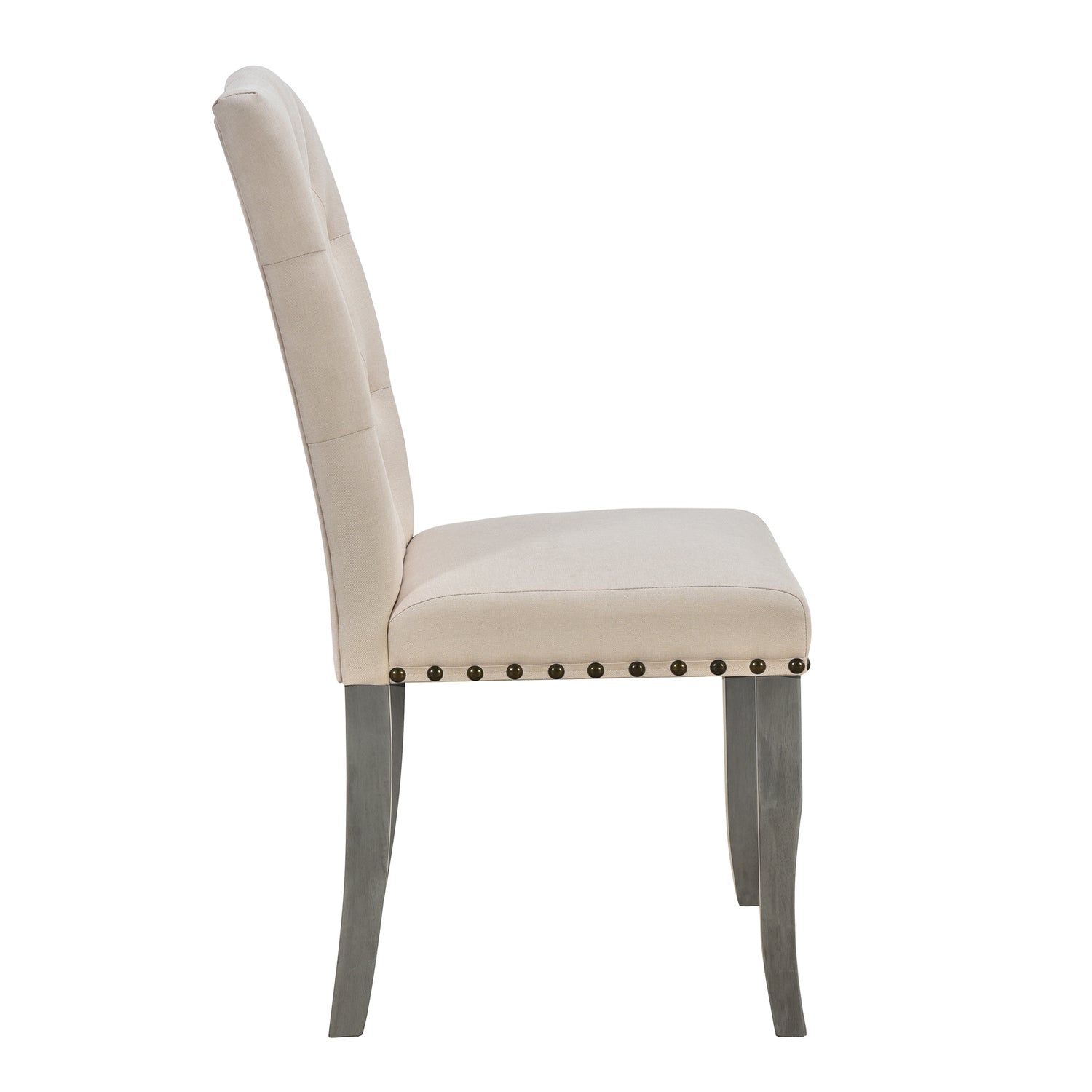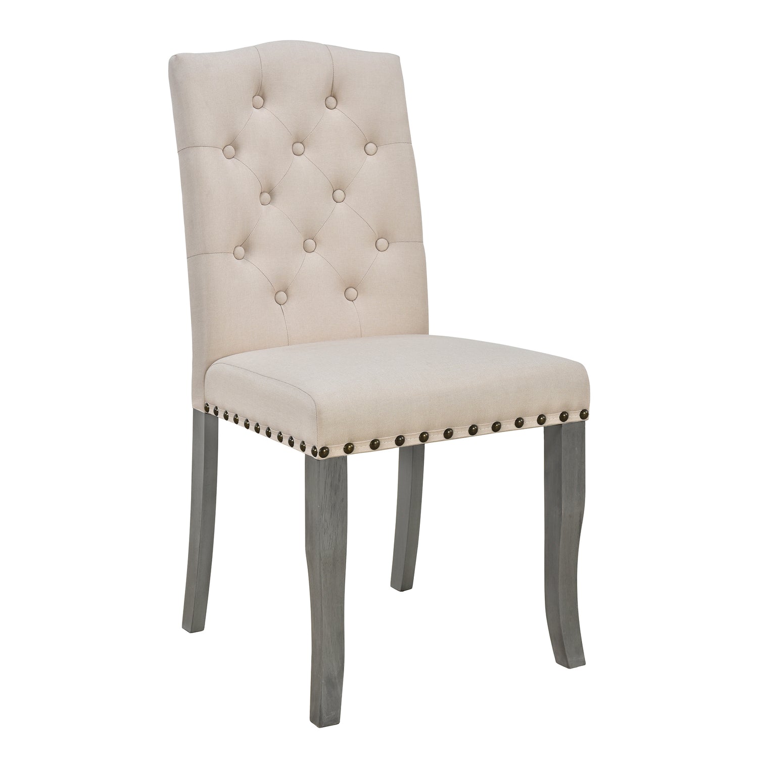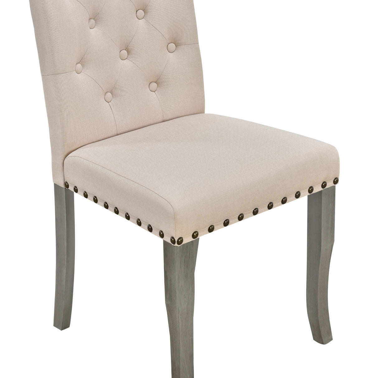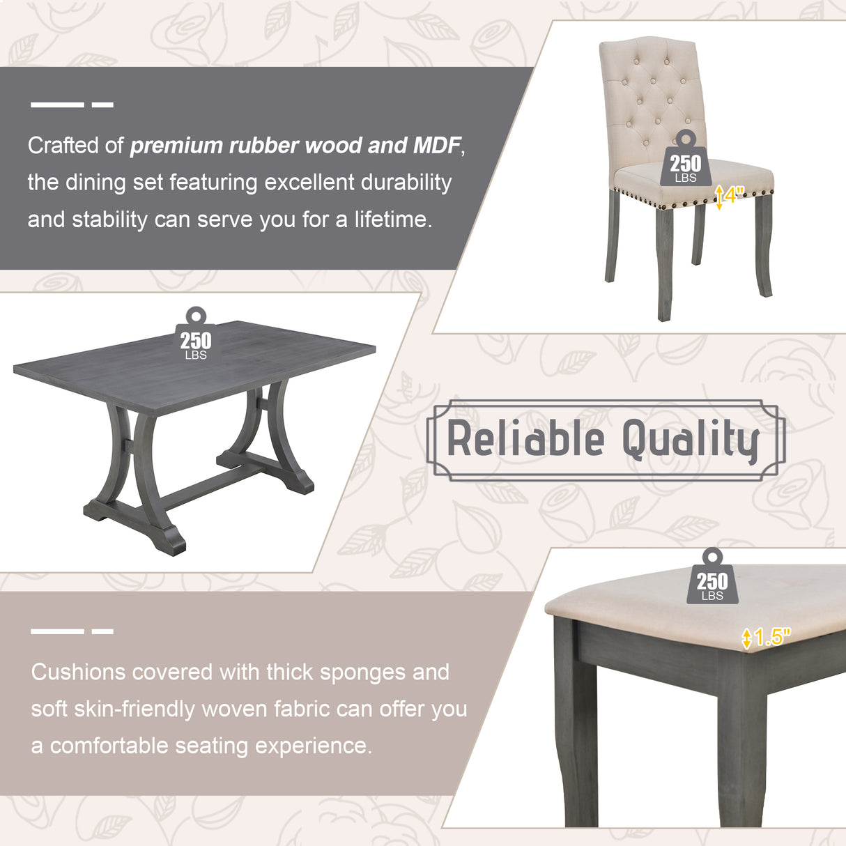 1. Rustic Style The tabletop is in a simple rectangular design, and its combination of rigidity and softness makes the artistic sense stronger. The natural wood grain of the tabletop of this dining table set complements a variety of unique interior styles by blending in seamlessly, especially in the color of natural wood wash. Its beautiful lines, modern nailhead decoration and delicate button tufting details are elegant and thoughtful in design, which reflect a variety of design aesthetics and can bring a rustic-romantic sense to your restaurant, kitchen area, or family bistro. 2. Family-Friendly Furniture Consisting of 1 dining table, 4 matching chairs and 1 bench, this 6-piece dining table set can perfectly accommodate your family members within no doubt and can provide a good experience for you and your family to get together. The design takes into account the sense of use and comfort. The spacious and 1.4” thick tabletop is advantageous to your placement of fruit bowls, vases, candles, etc., and you don’t have to worry about its stability and capacity. 3. Reliable Quality The dining tabletop is made of MDF and Okoume wood veneer with a clear wood texture and smooth touch. As all other parts are crafted of tip-top quality solid rubber wood, needless to say, the dining set featuring excellent durability and stability will serve you for a lifetime. The table, chairs, and bench all have a load-bearing capacity of 250 LBS. Covered with thick sponges, the 4” thick linen chair cushions and 1.5” thick linen bench cushion can offer you a comfortable seating experience and cause no skin irritation. 4. Exquisite details The curved trestle-shaped table legs demonstrate a unique aesthetic feeling, showing the soft and elegant effect of American style. The backrests of the chairs are ornamented with tufted buttons that form an elegant argyle pattern. With nailhead decoration around the side of the upholstered chair cushions, this rustic dining table set makes an impact on the modern and contemporary style. These delicate details can make the dining set less homogeneous and more distinctive. 5. Assembly & Customer Service Full assembly required. This dining table set comes with detailed instructions, and it can be installed step by step following the instructions, which can help you complete the assembly as soon as possible.