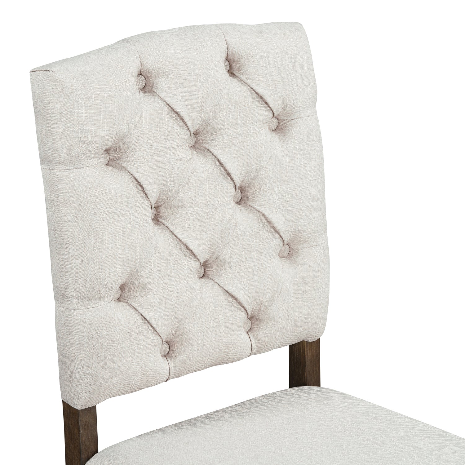 - Multi-step finish system highlights the natural beauty of the acacia wood veneer of the tabletop. The cross-shaped legs make the table look a bit like a scale from the front. Also about the dining chair set, its beautiful lines, back flared legs and delicate button tufting details are elegant and thoughtful in design. No matter where it is placed, it will become an eye-catching ornament in your dining room or living room.