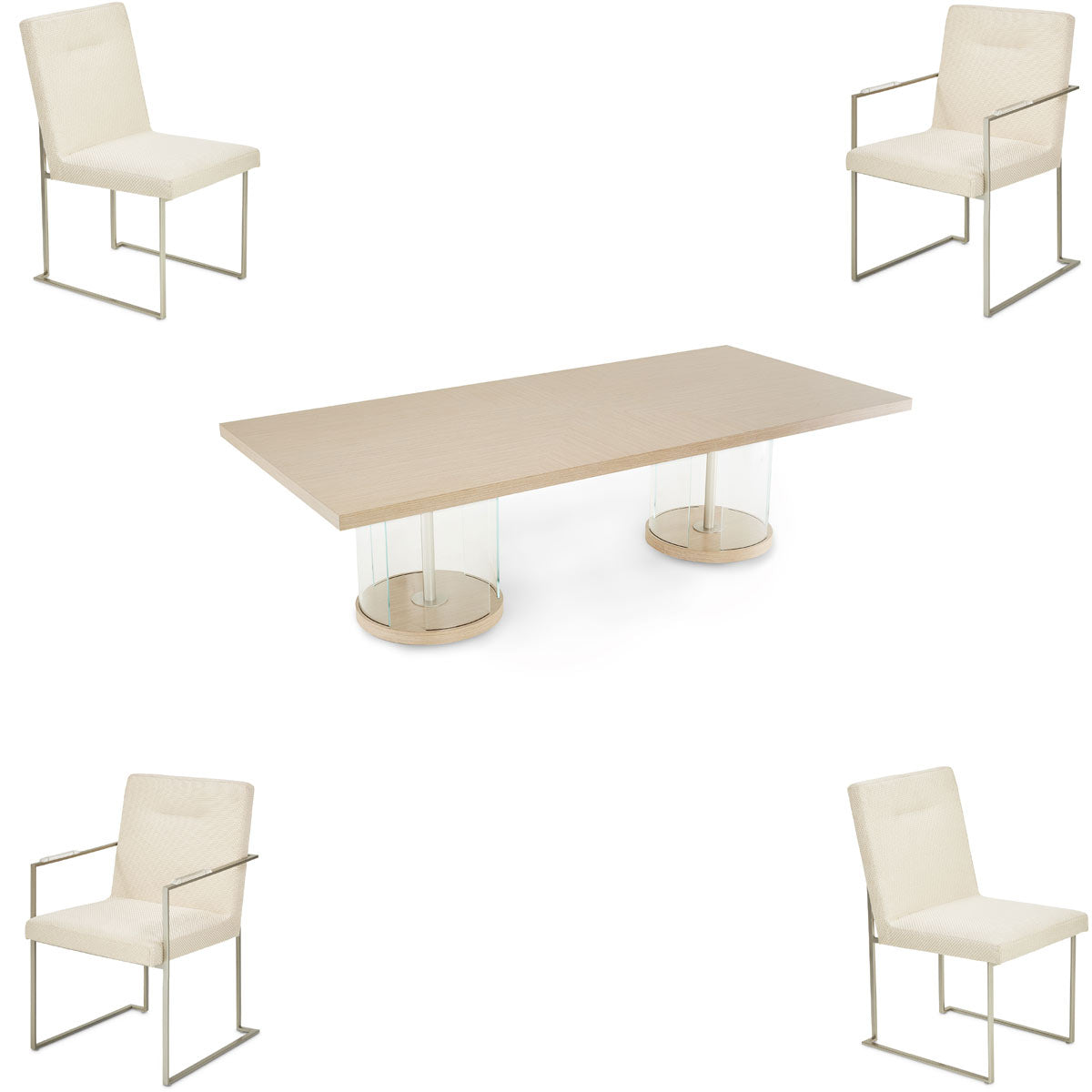 The Laguna 5-Piece Rectangular Dining Table Set by AICO Furniture blends innovative serving features with refined craftsmanship. Finished in Washed Oak with Brushed Silver accents, the set showcases a sculptural pedestal (brushed platinum center post + curved acrylic panels) and a raised Lazy Susan—pairing high-class style with practical hosting.