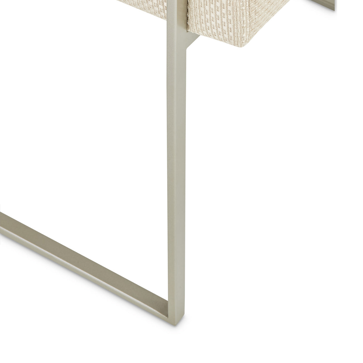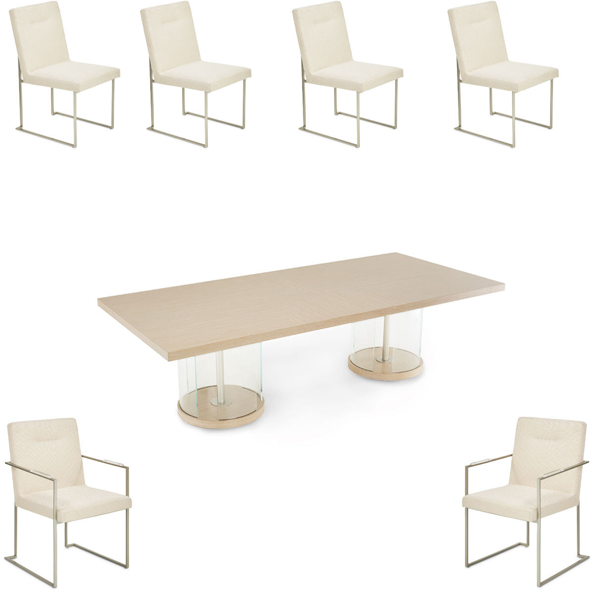 The Laguna 7-Piece Rectangular Dining Table Set by AICO Furniture blends innovative serving features with refined design. Showcasing oak veneer in a Washed Oak finish, a sculptural pedestal with a brushed platinum center post and curved acrylic panels, and a raised Lazy Susan at center, this set includes a 108" x 50" table, four side chairs, and two arm chairs.