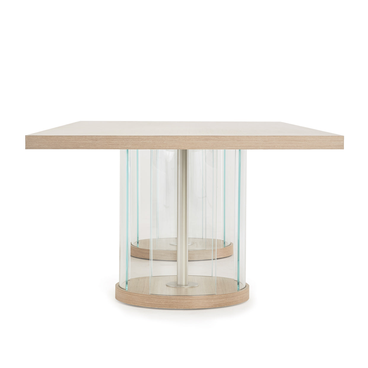 Part of the Laguna Collection, this dining set delivers high-class style and everyday practicality. The tabletop and base are finished in Washed Oak over oak veneer, complemented by a Brushed Silver accent palette. The raised Lazy Susan makes family-style dining effortless, while the pedestal’s brushed platinum center post and curved acrylic panels create a modern, gallery-like presence that turns mealtime into a moment.