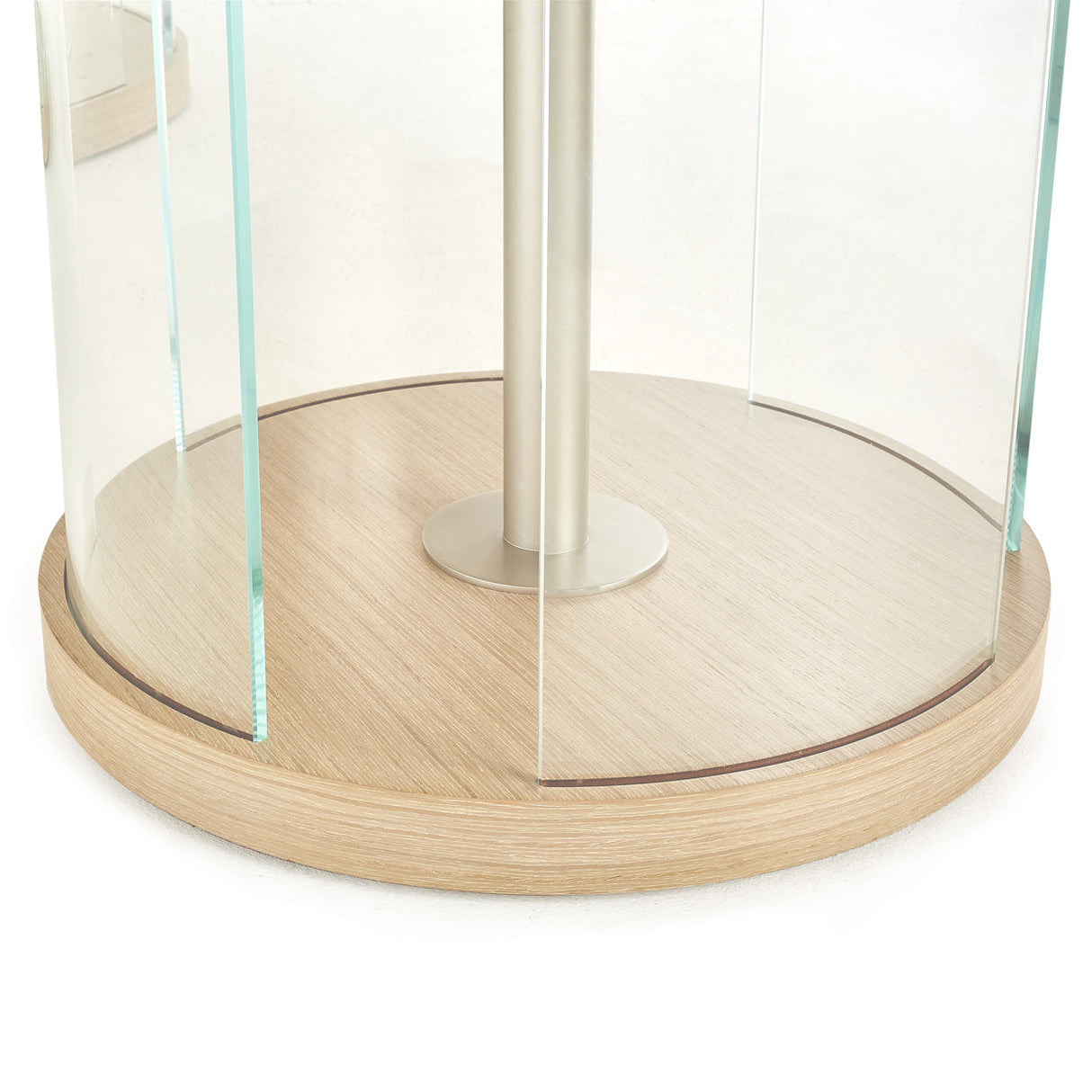 - Sculptural pedestal with brushed platinum center post and curved acrylic panels