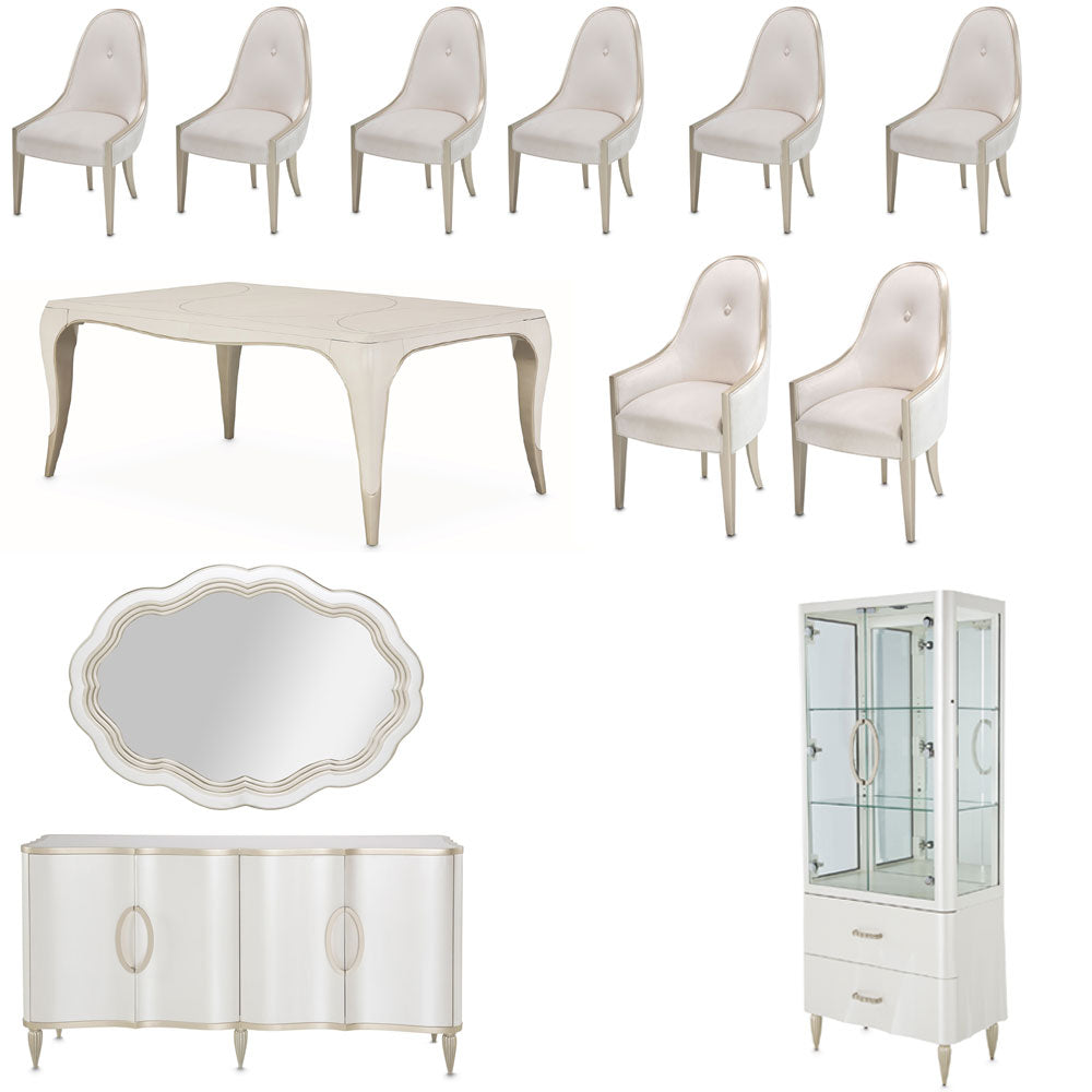The London Place 12-Piece Rectangular Dining Room Set by AICO Furniture defines classy living with its luminous Creamy Pearl finish, platinum accents, and graceful silhouettes. This complete suite—featuring an extendable table, seating for eight, a sideboard, a wall mirror, and a display cabinet—delivers a cohesive modern-glam dining experience for everyday elegance and special occasions.