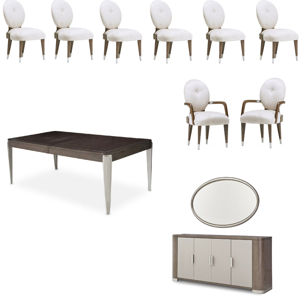 - Includes: Rectangular dining table, 6 side chairs, 2 arm chairs, sideboard, and wall mirror