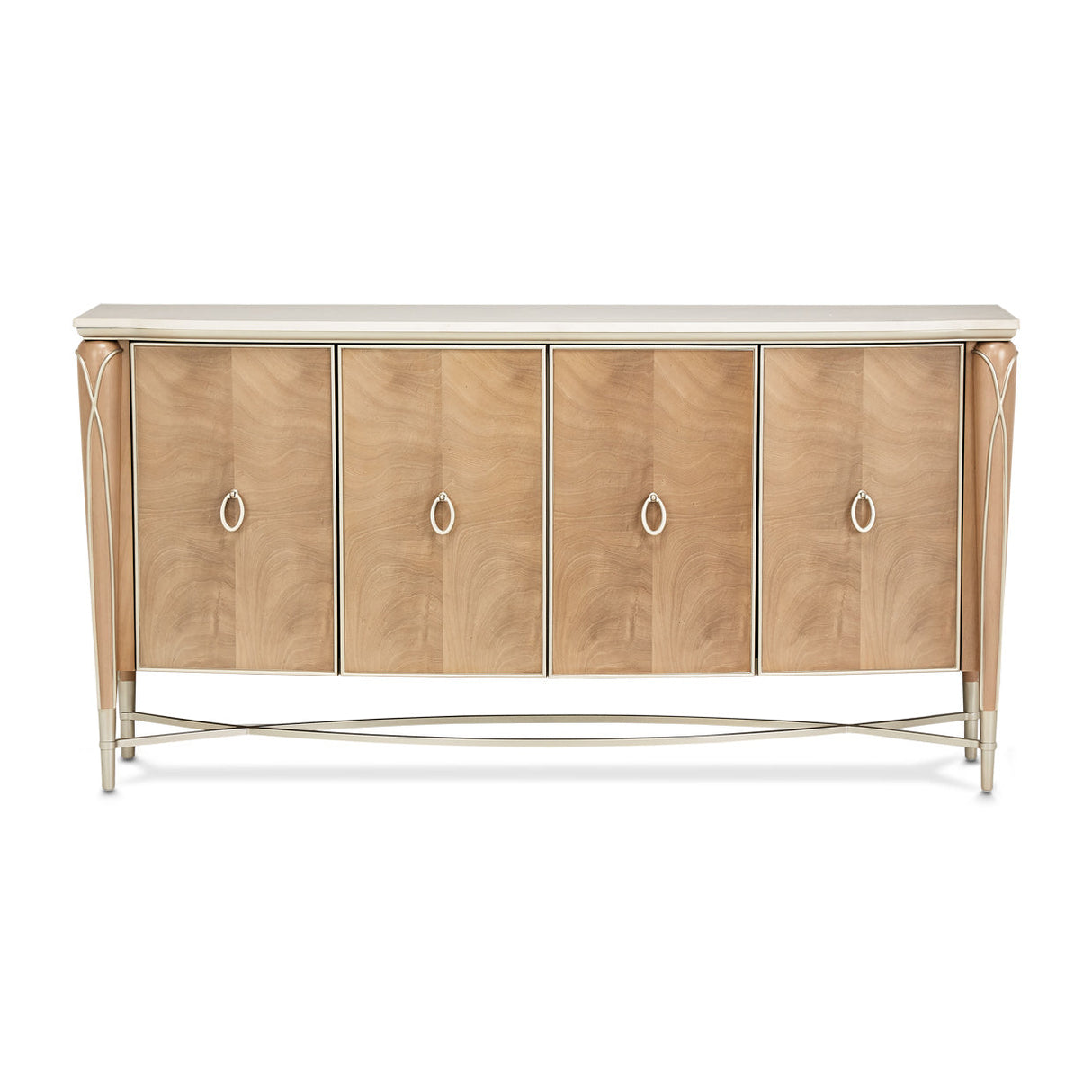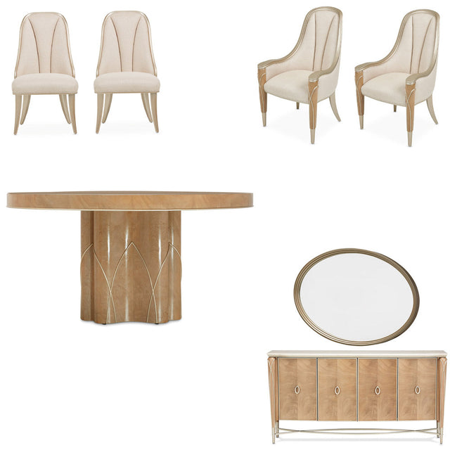 The Villa Cherie Caramel 7-Piece Round Dining Table Set by AICO Furniture blends modern glamour with timeless elegance. Finished in warm Chardonnay with a swirl mahogany tabletop, this luxury set includes a clover-pedestal table, two side chairs, two arm chairs, a sideboard, and a sideboard mirror—perfect for creating a sophisticated dining experience in any home.