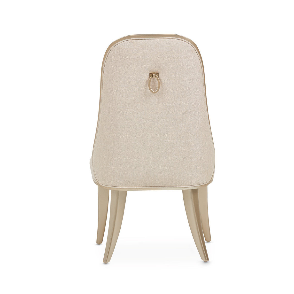 The Villa Cherie Caramel Collection is designed for both quaint spaces and luxurious dining rooms. The round dining table features a pre-dyed swirl mahogany top in a caramel finish, accented with platinum paint. A beautifully shaped clover pedestal base showcases a crossed rope motif finished in Chardonnay, complemented by matching leg accents, trim, and feet. This set pairs functionality with refined design, creating a dining space that’s both welcoming and elevated.
