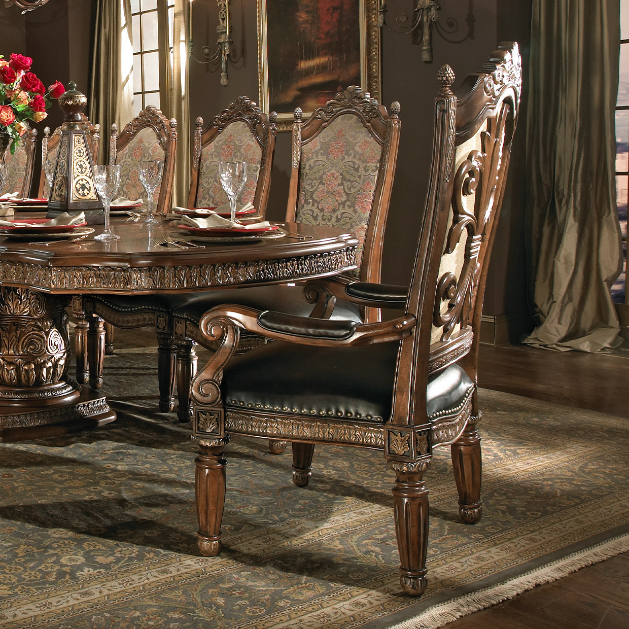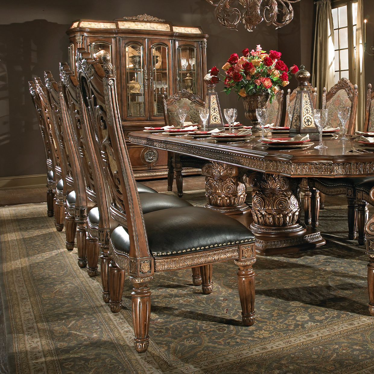 The Villa Valencia 7-Piece Rectangular Dining Table Set by AICO Furniture is a luxury traditional dining room set featuring an extendable table, leather-upholstered chairs, and Old World Spanish craftsmanship in a rich Classic Chestnut finish. Designed for formal dining and upscale entertaining, it includes a grand rectangular table with three 20-inch leaves, intricate marquetry, marble pilasters, and carved wooden detailing—ideal for buyers seeking elegance, functionality, and heirloom-quality design.