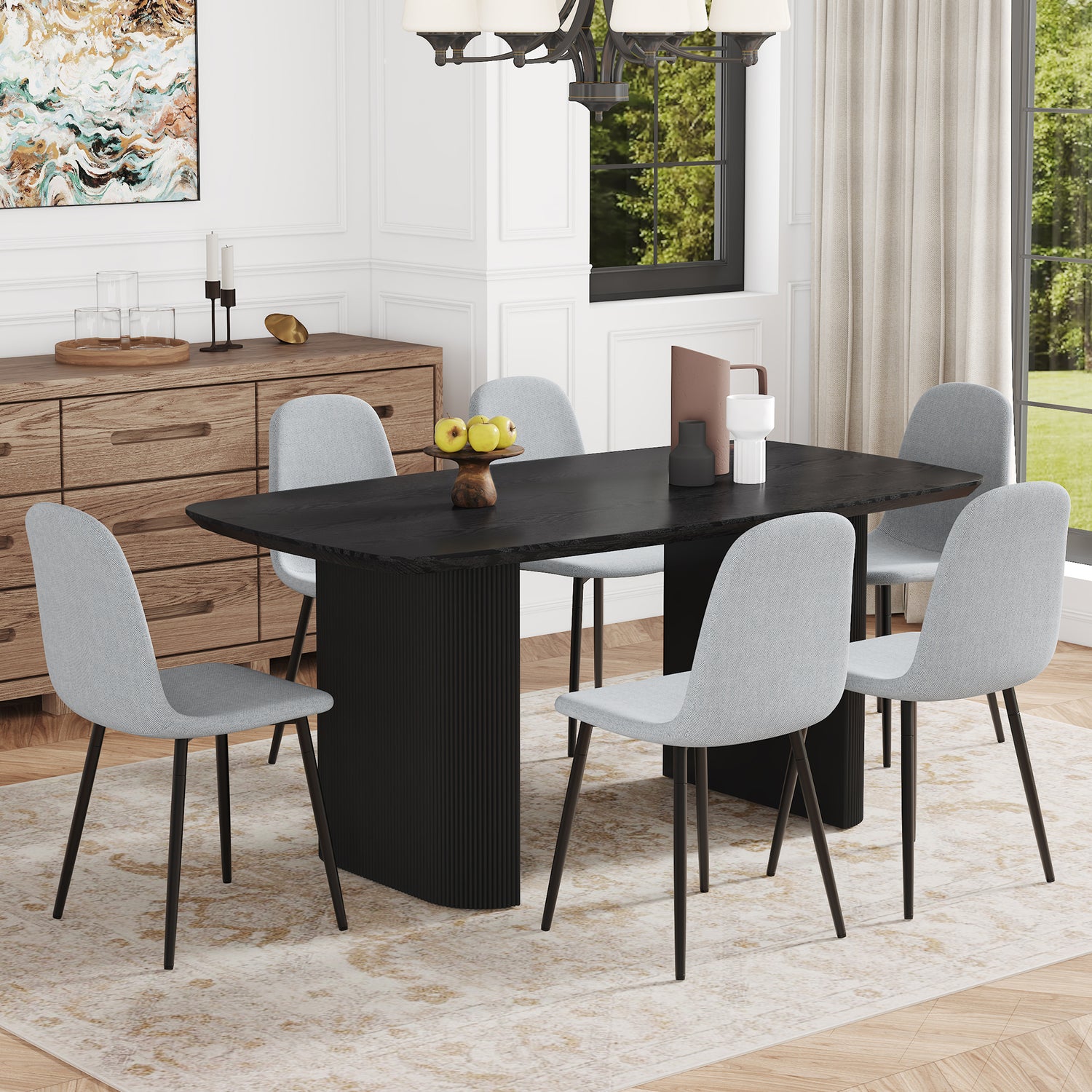 Table and chair set.67 * 35.4 inch black wood grain MDF dining table: a simple and luxurious, stable choice.Paired With 6 Light Gray Linen-Cotton Material High Resilience Dining Chair with Metal Leg.