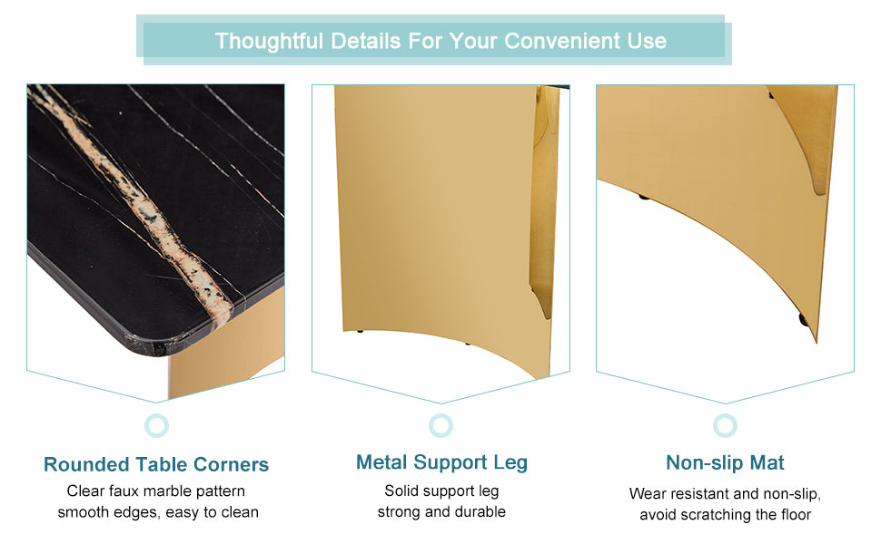 Table and chair set.The table has a glass tabletop with imitation marble pattern stickers and stainless steel golden legs.Paried with 6 comfortable chairs with PU seats and metal legs.W1151S01511